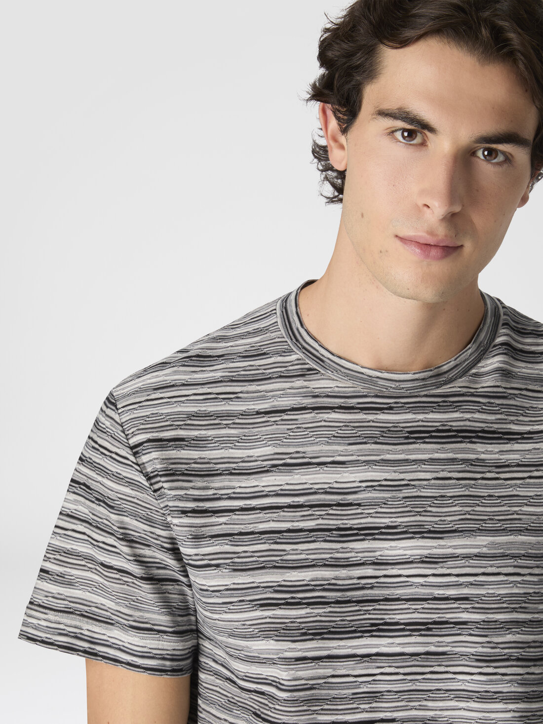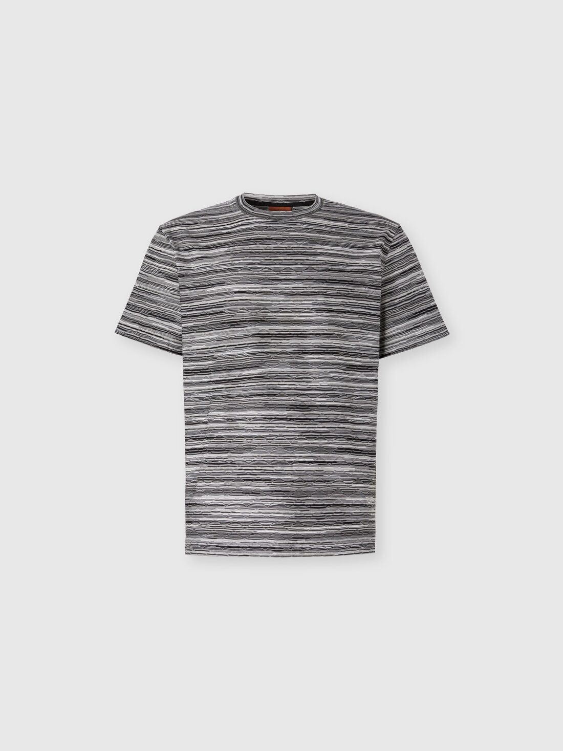 A celebration of Missoni’s style and craftsmanship: this men’s short-sleeve T-shirt combines the relaxed elegance of a regular fit with the sophistication of slubbed striped jersey, enriched by the unmistakable zigzag motif made with jacquard workmanship. Made of 100% cotton, it is an iconic and versatile piece that merges comfort and visual identity in perfect Missoni style.