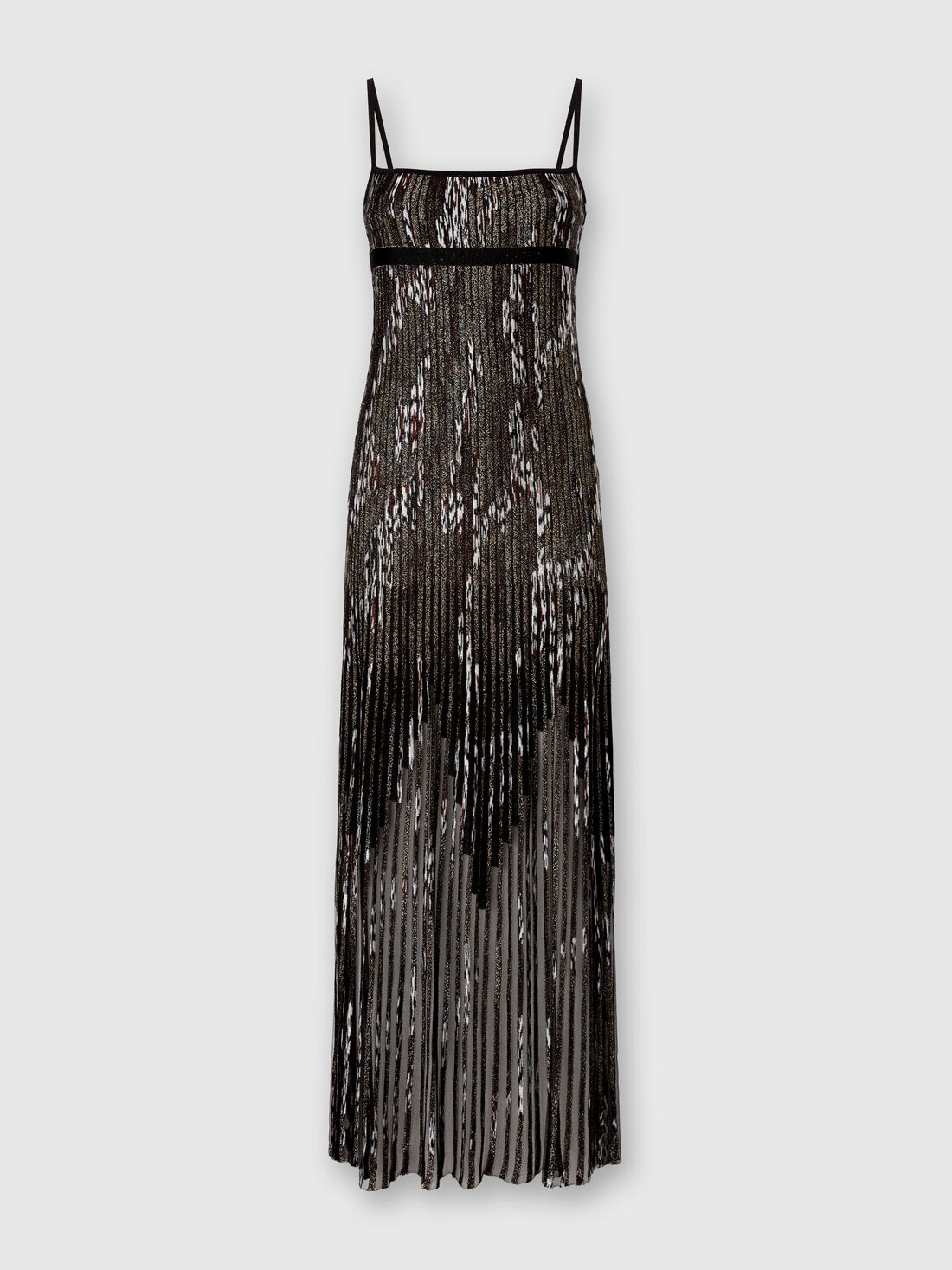 A sleeveless long dress that blends sophistication with movement. The jacquard knit in Missoni’s signature zigzag motif features a pleated effect for added fluidity, while lamé threads add radiant luminosity. A perfect mix of tradition and modern design.