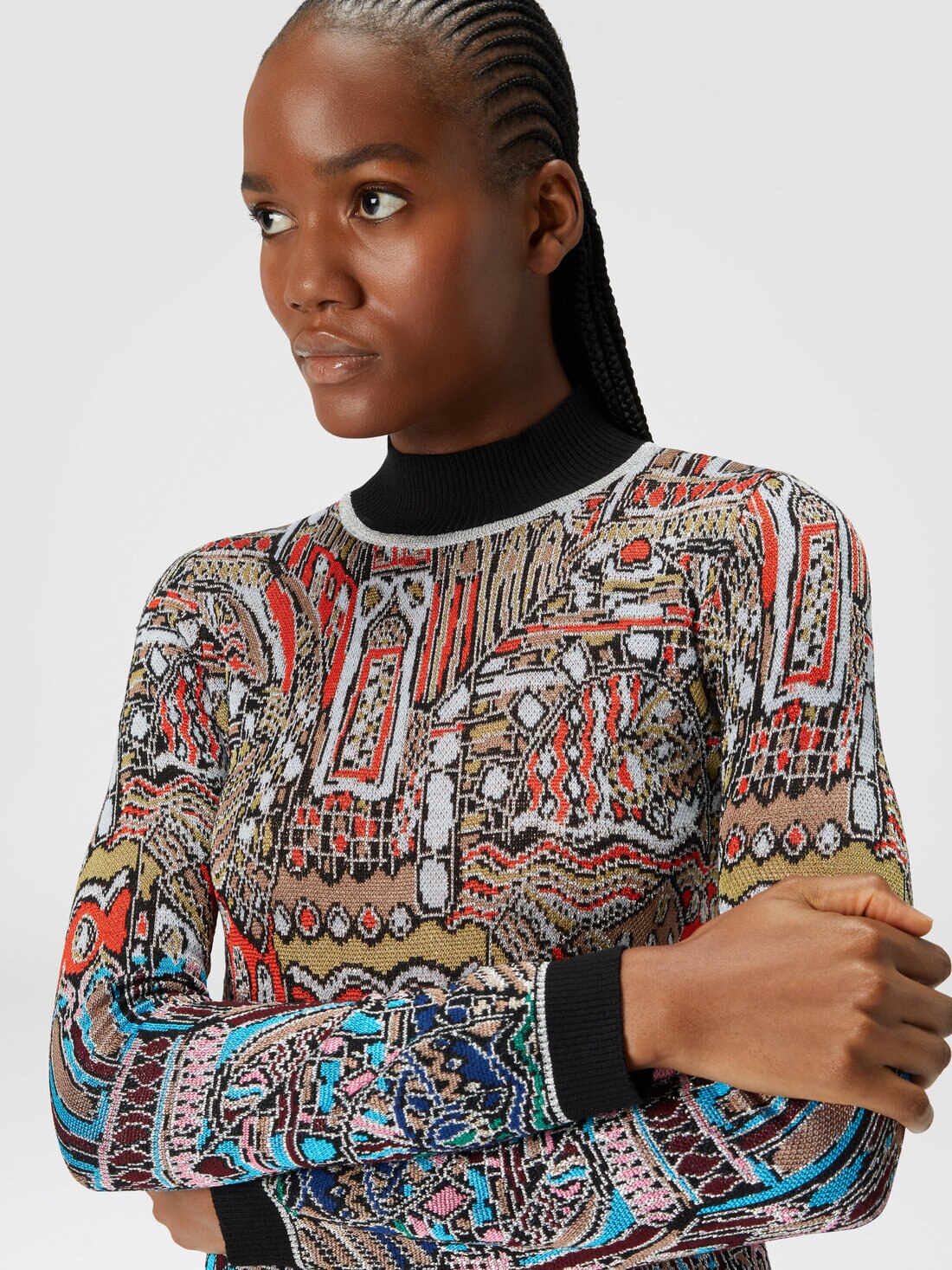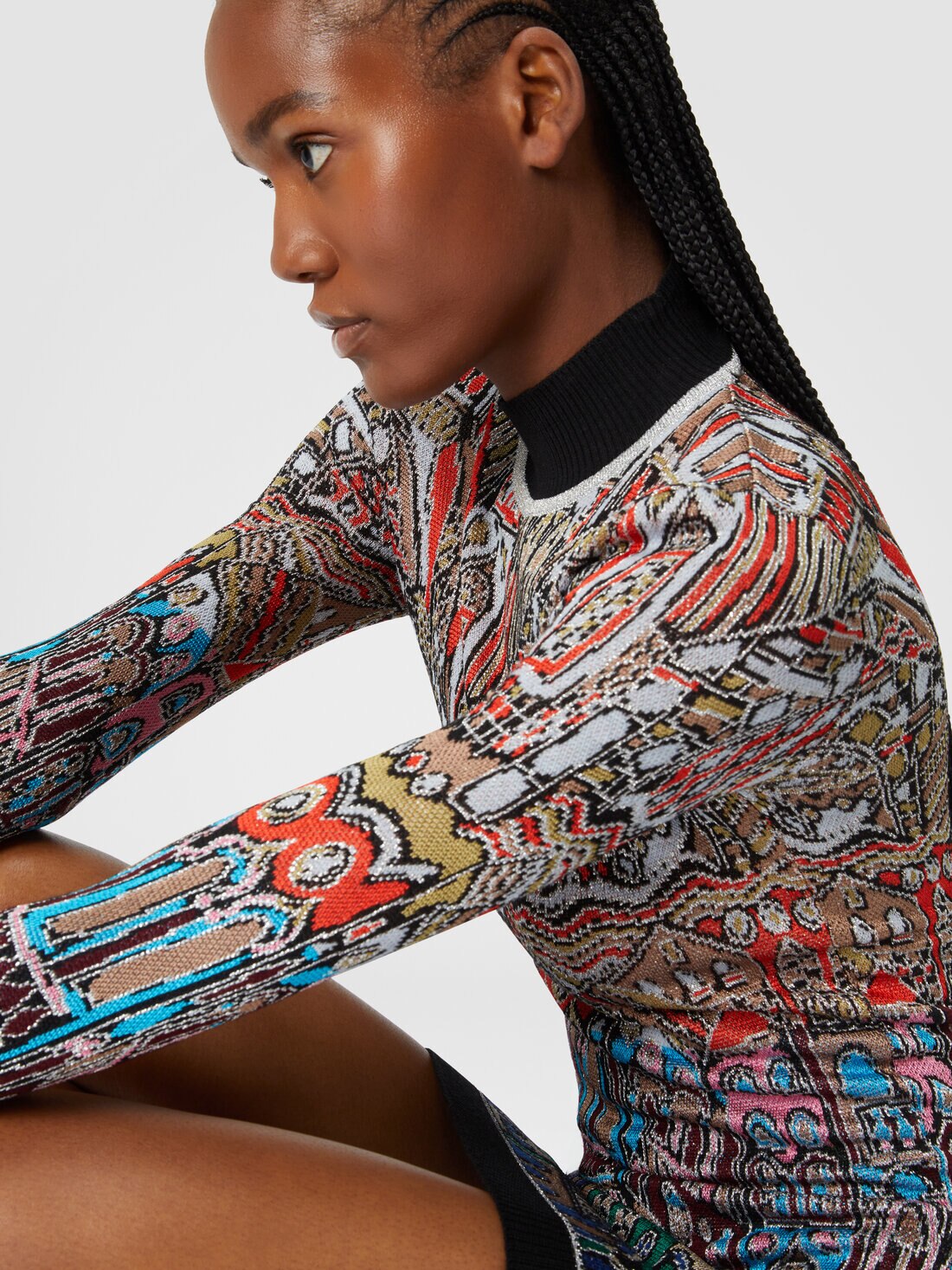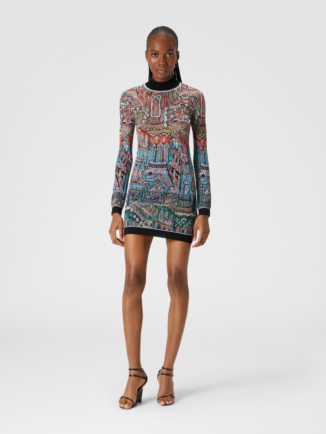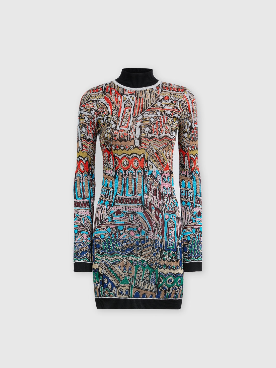 A new pattern of the season, the jacquard Venezia motif animates the wool and cotton knit surface of the dress with a high collar and contrasting piping. A postcard garment that pays homage to one of the most iconic cities in Italy.