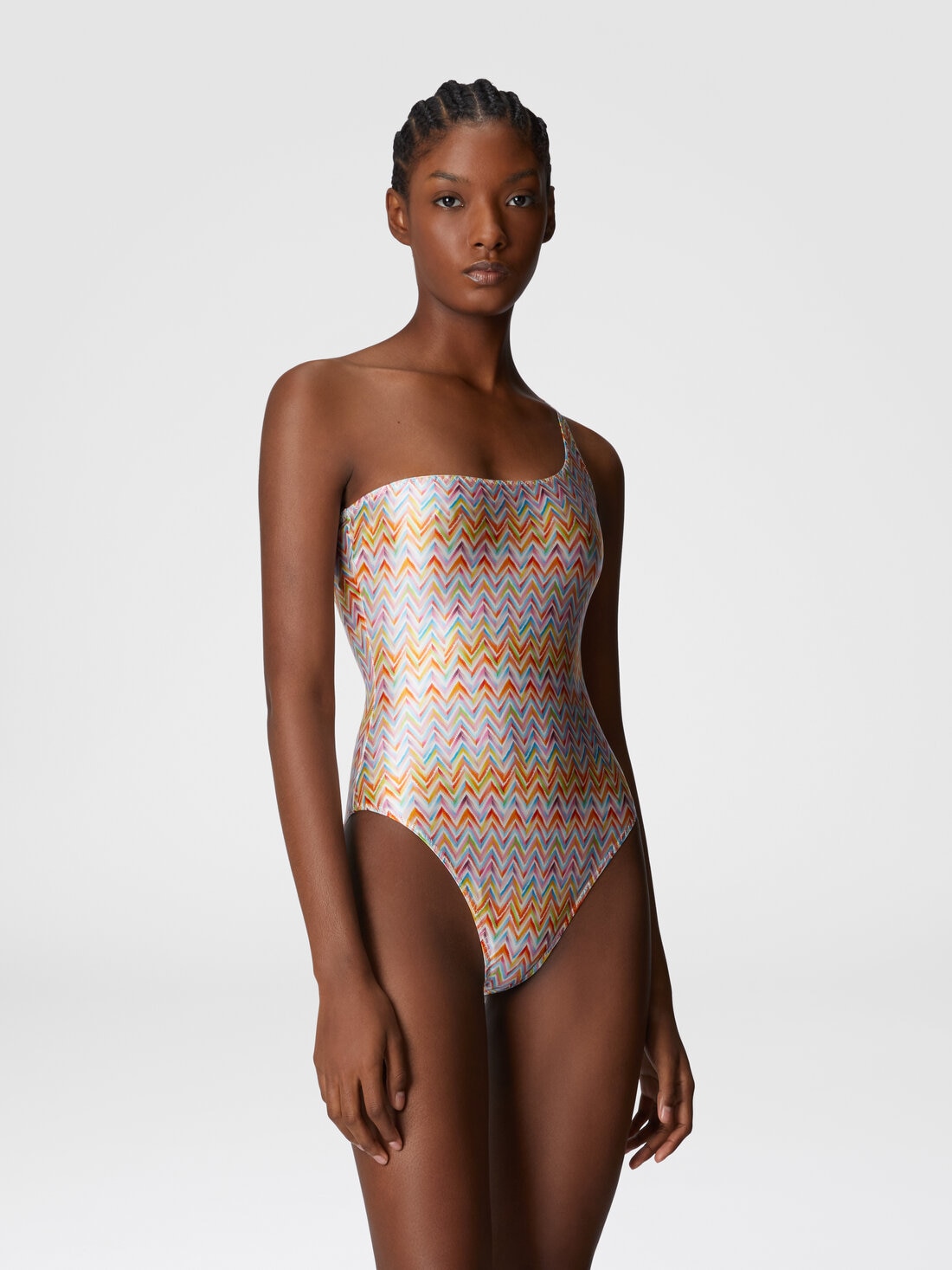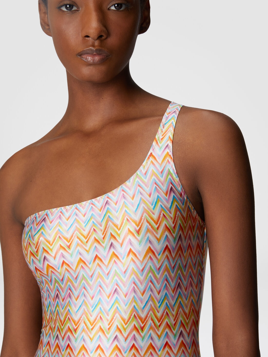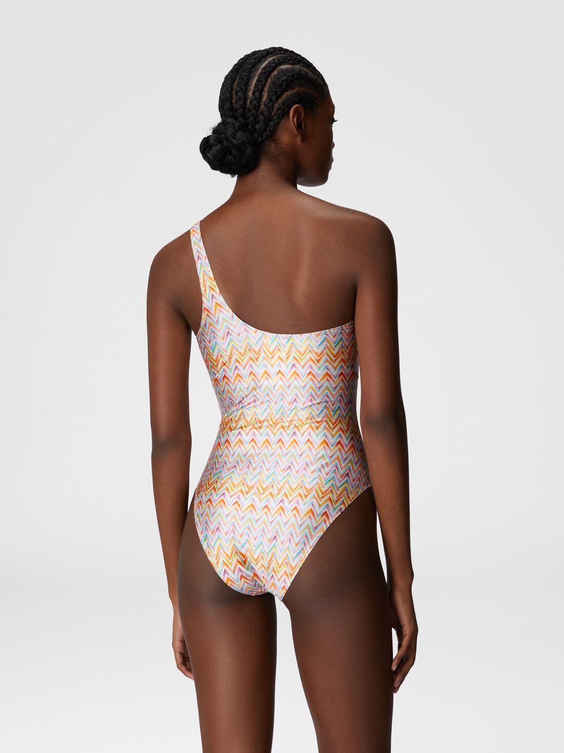 Contemporary design for this one-shoulder one-piece swimsuit, made from printed technical fabric with the iconic zigzag pattern. A perfect choice for a modern, distinctive look that celebrates the female silhouette.