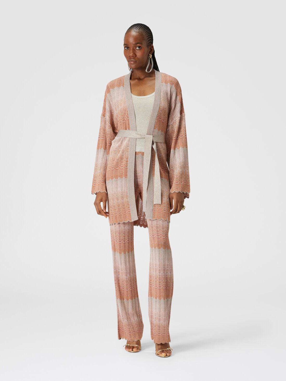 Finished with contrasting piping, the cardigan with belt at the waist and wide sleeves is embellished with a Greek zigzag pattern and lit up by the sparkle of lamé. The profiles of the garment continue the decorative motif, for a result of extreme refinement.
