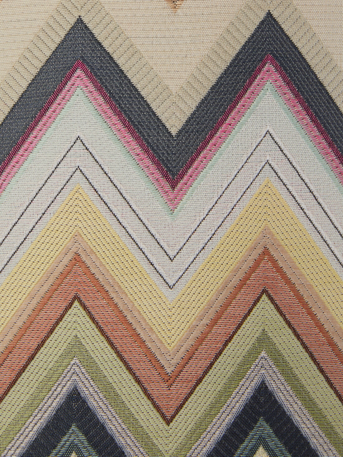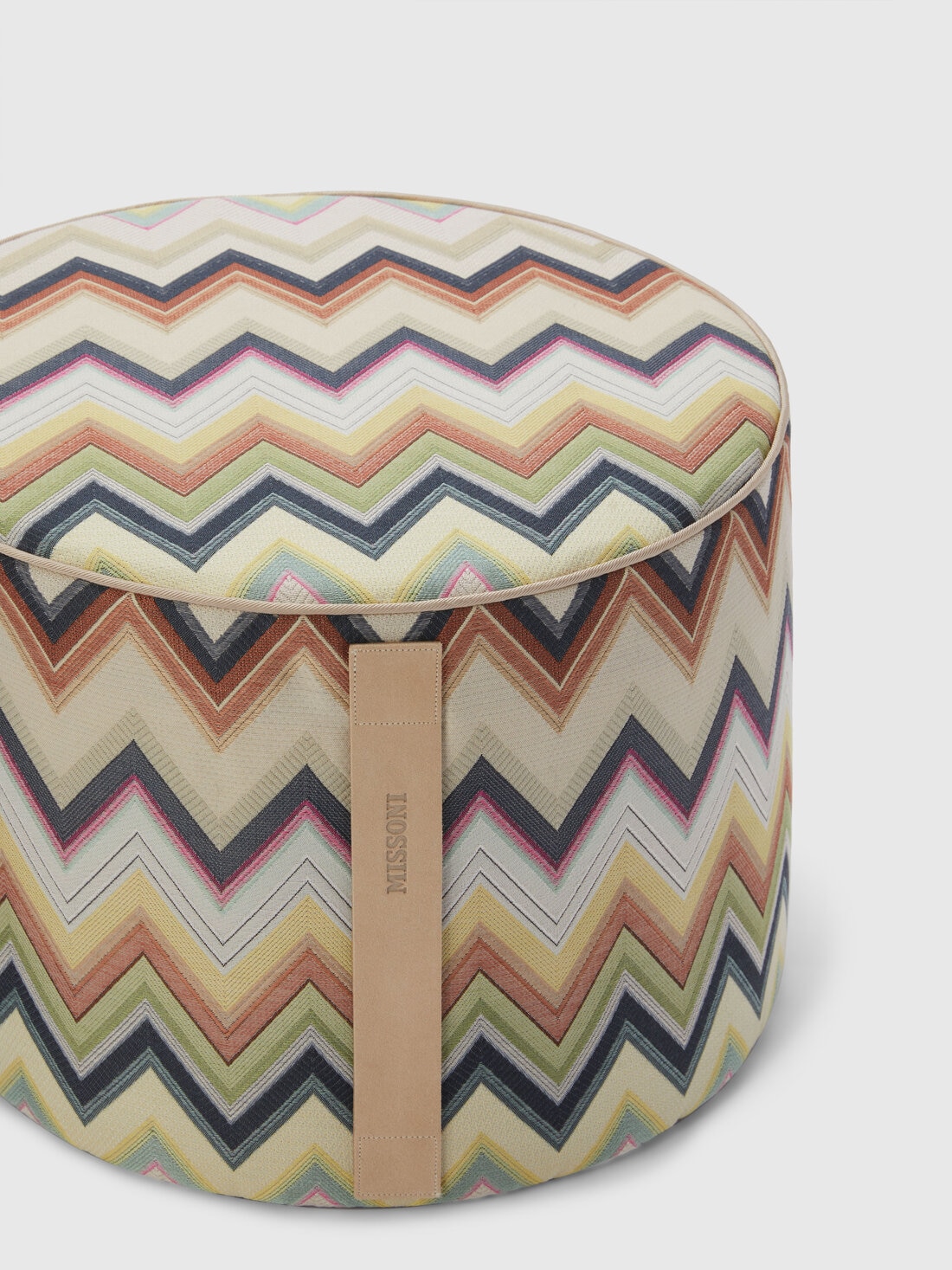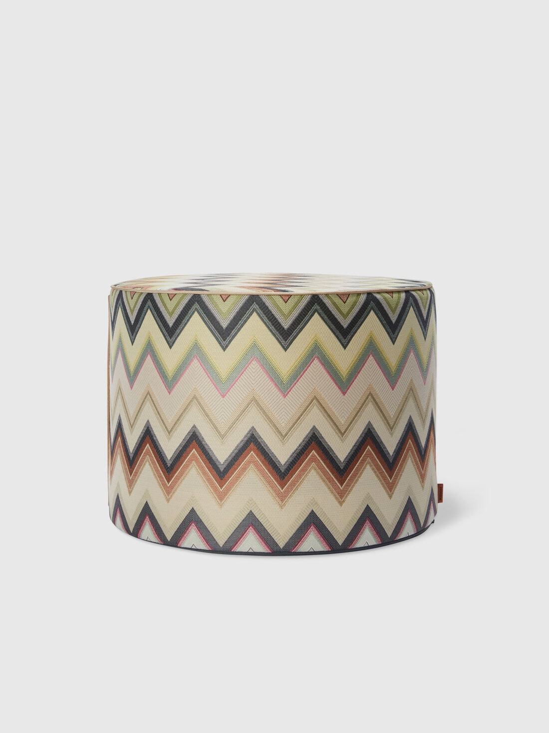 A chevron cotton blend fabric characterises the 40x30 cm Agadir cylindrical pouffe. Finished with tone-on-tone piping and personalised by the logo-printed label, this textile home furnishing accessory is made practical and manageable by the logo-imprinted suede handle.