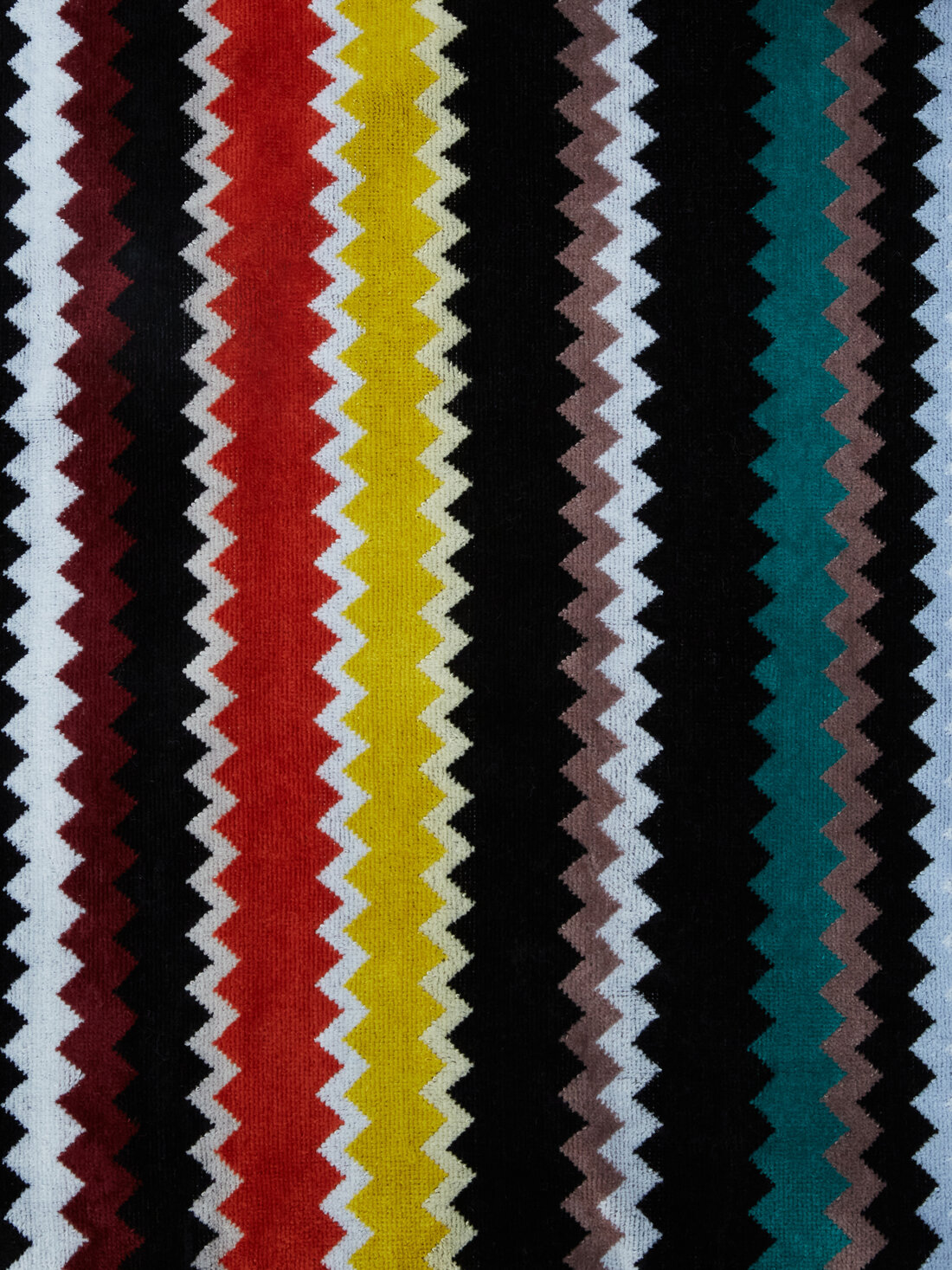 Curt, the new hooded bathrobe, boldly declares its allegiance to the Missoni universe with an all-over zigzag pattern. The multicoloured pattern that covers the model creates a rhythm endowed with a very recognisable sense of style, as is typical of MissoniHome.