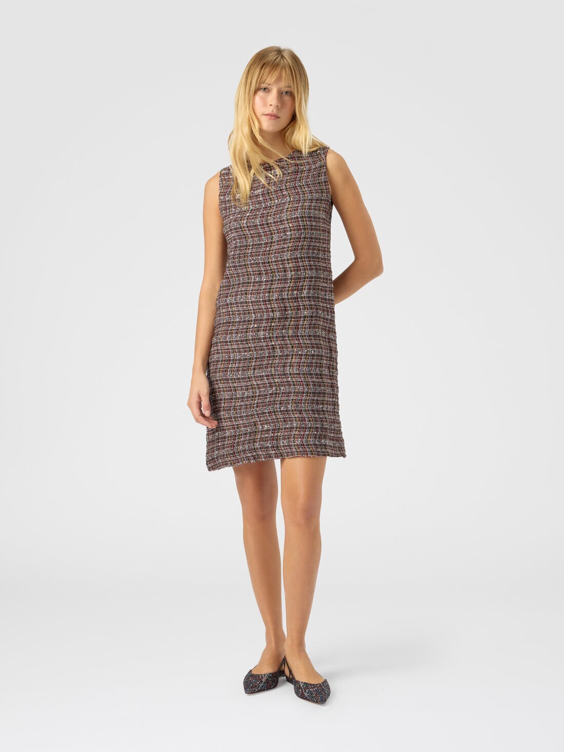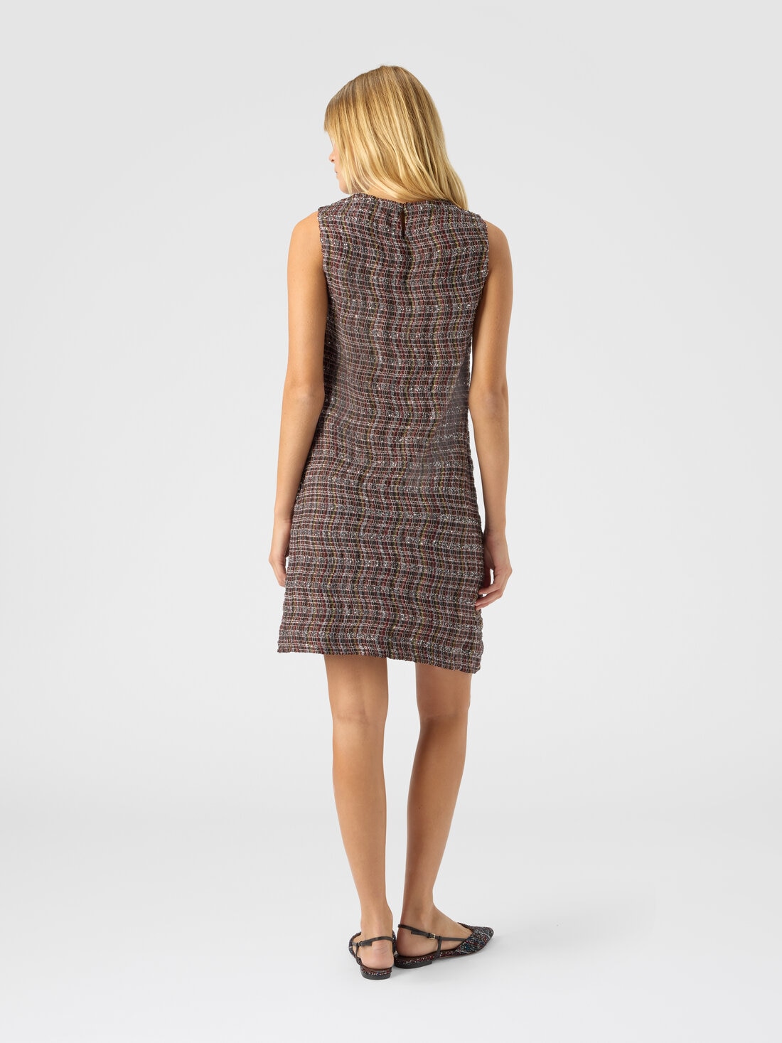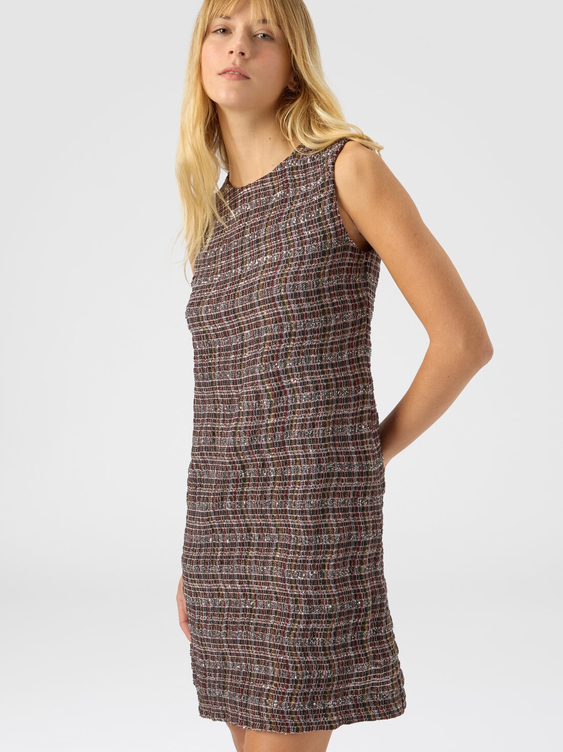 Bold and contemporary, this sleeveless women’s crewneck mini dress captivates through its refined textile detail. Made on a Caperdoni loom, it features a sophisticated check wave pattern woven into the fabric, enriched with lamé threads for a subtle touch of light.