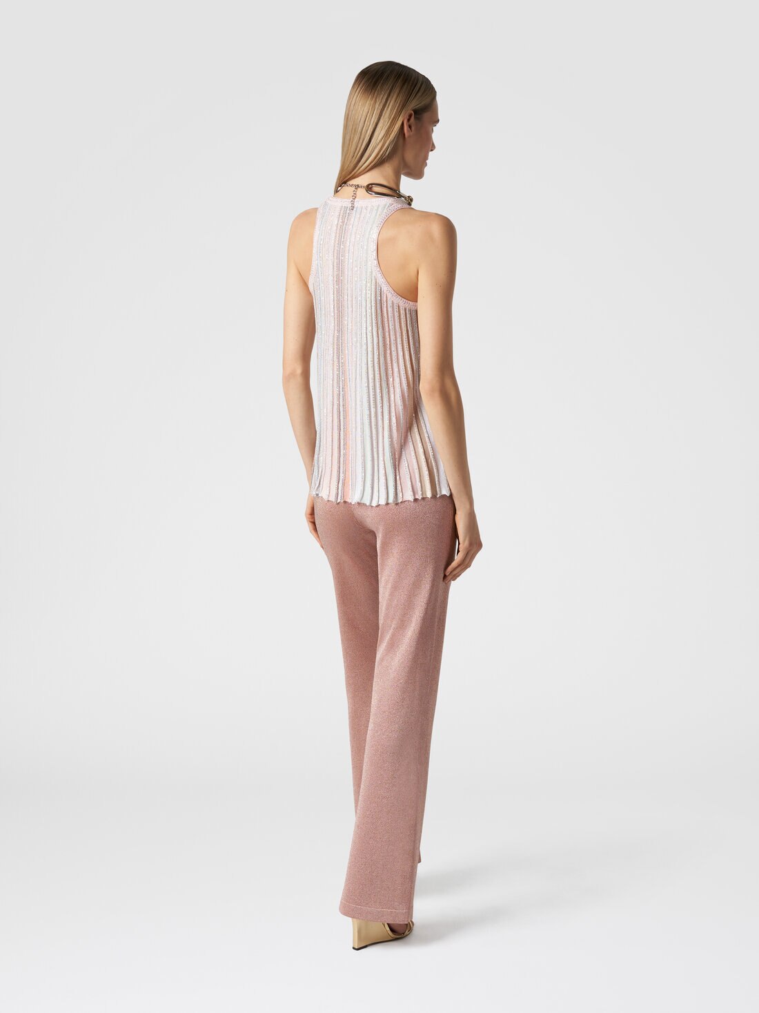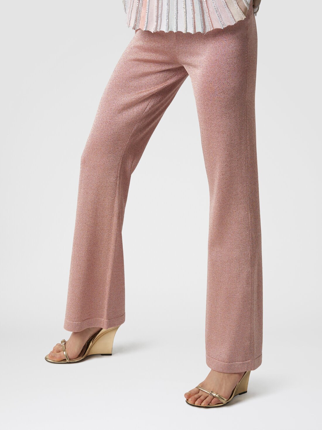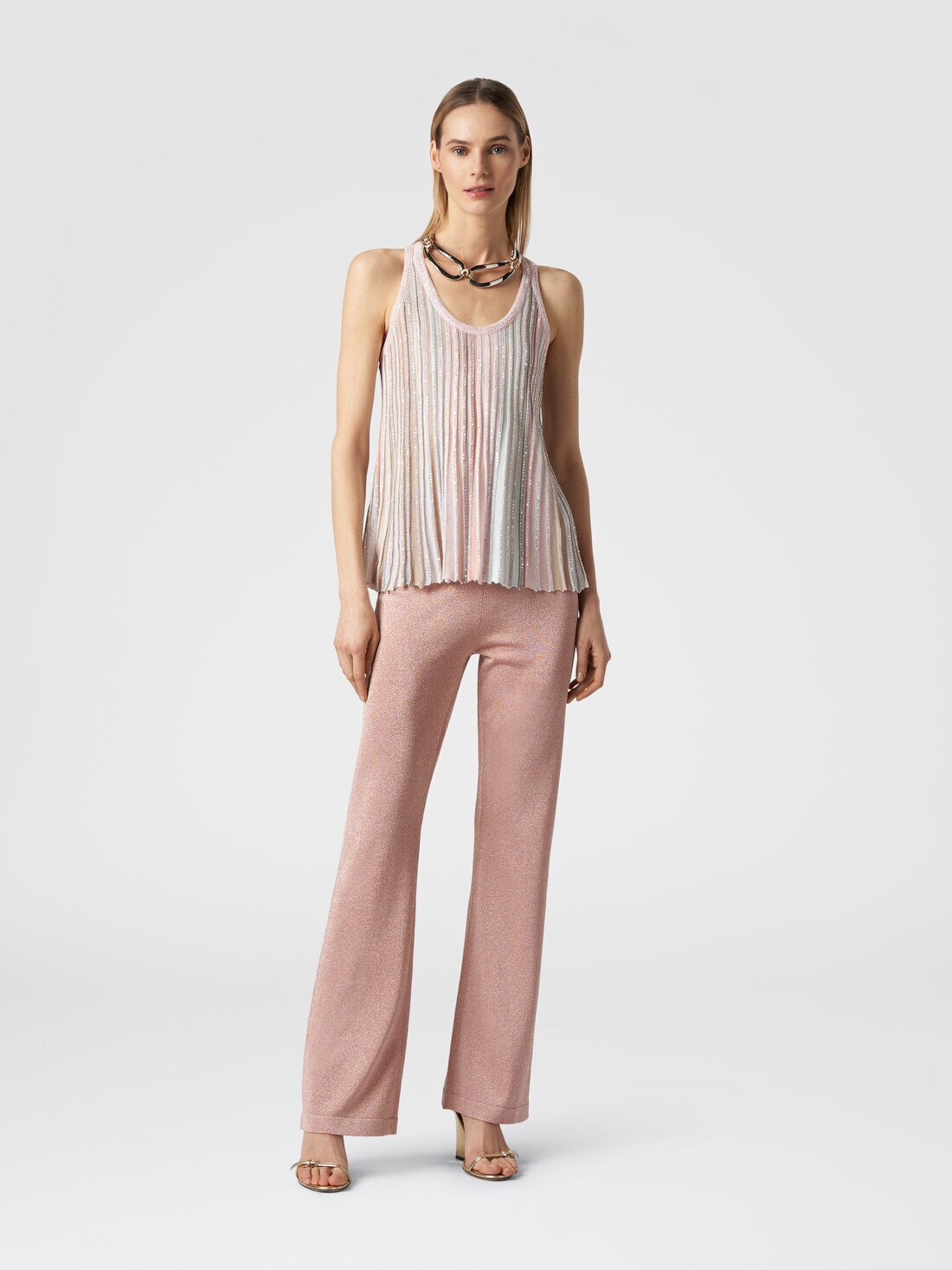 The emphasis on movement, ensured by the lightweight refined vanisè knit with lurex, sets the women’s straight trousers apart. A piece that is easy to wear, thanks to the elasticated waistband, and perfect for creating ever-changing but impeccably Missoni-style looks.