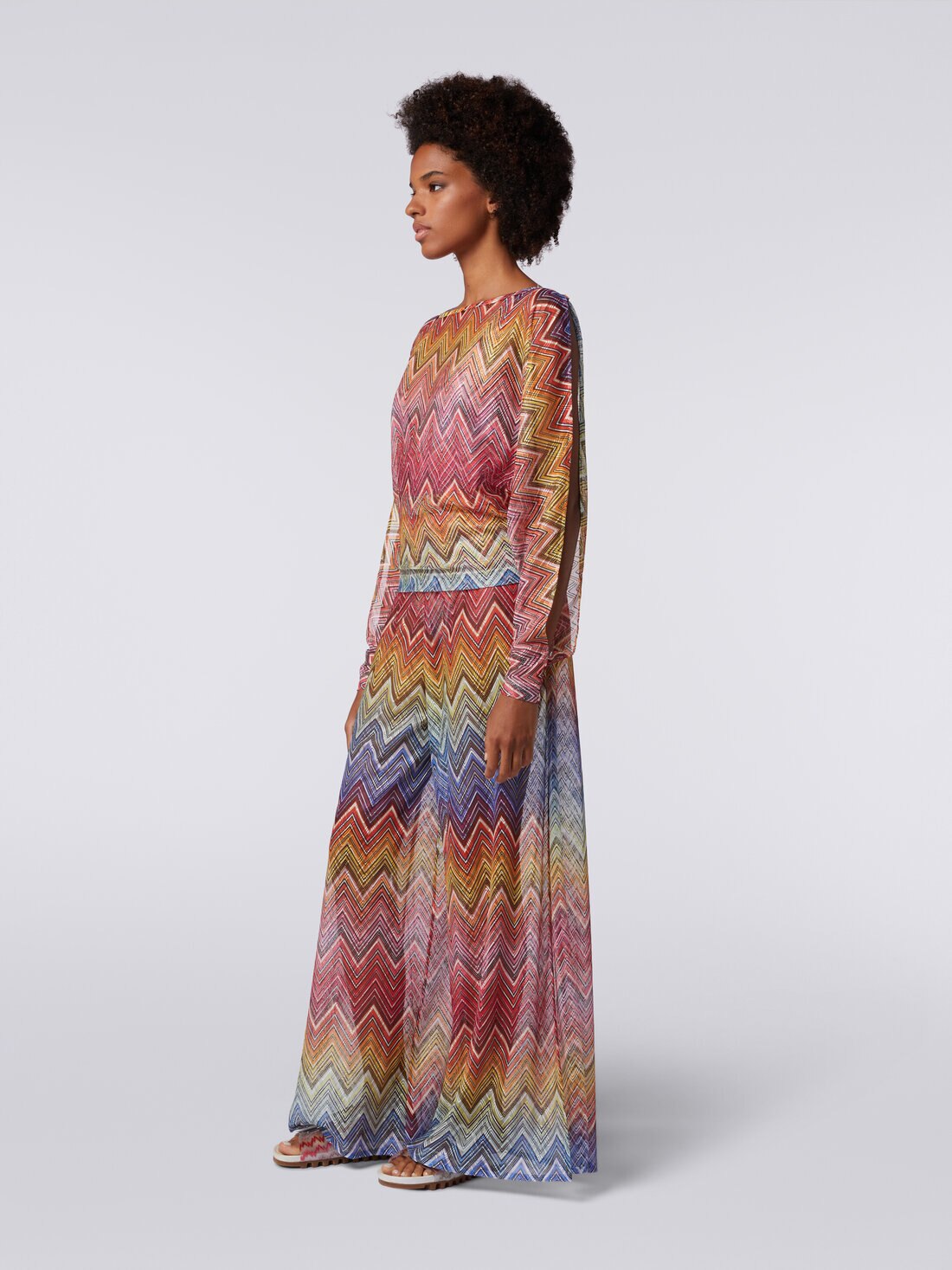 Enriching even a simple women’s blouse with a bespoke touch is one of those masterful touches Missoni has accustomed us to. The boat-neck sweater, in zigzag print fabric, features a cut-out detail that opens the sleeves at the sides.