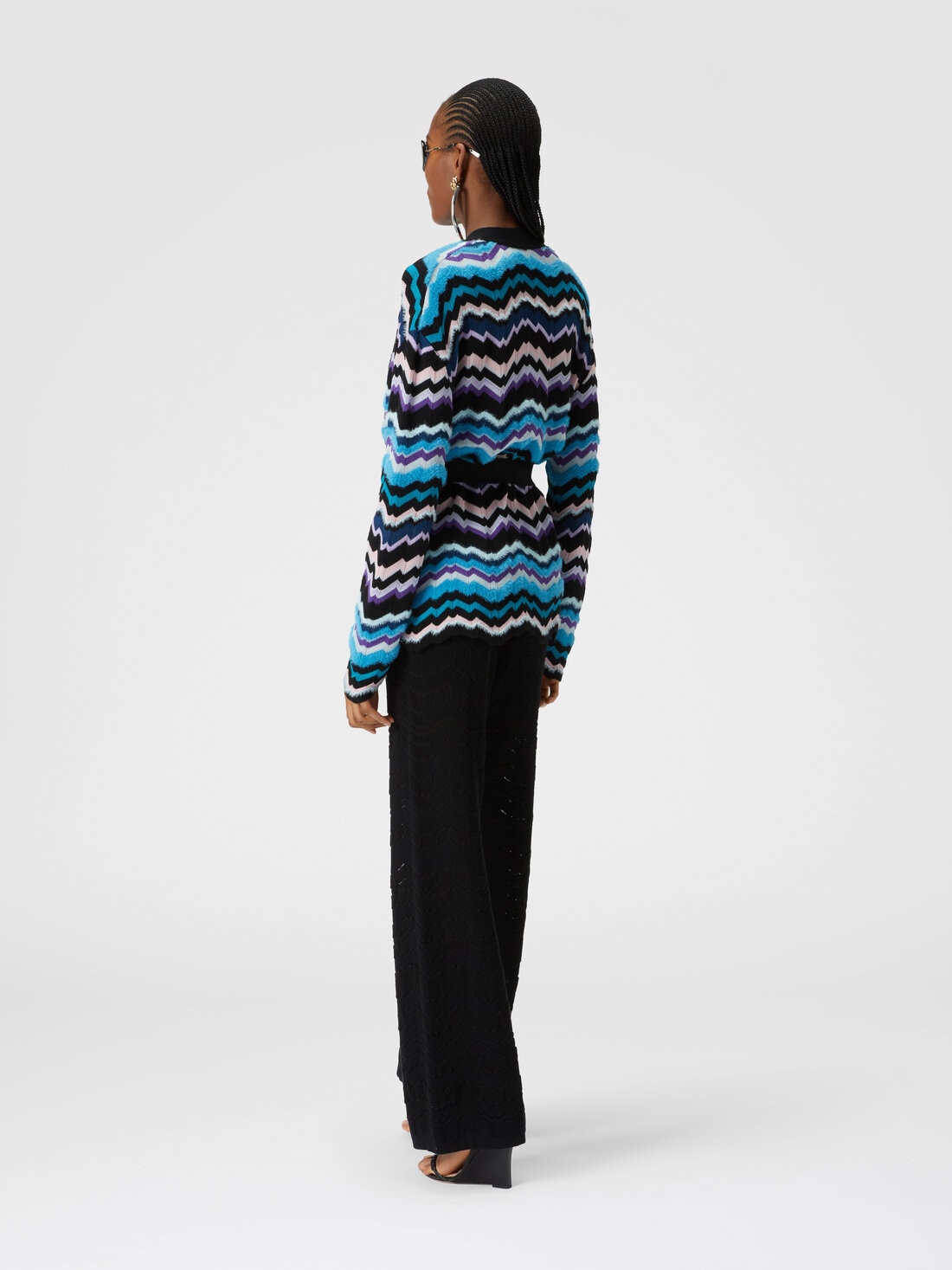 Missoni's everyday couture is renewed thanks to the zigzag Greek pattern that characterizes the cardigan with buttons and belt at the waist. The wool yarn, made soft by viscose, offers the perfect base for the model with an asymmetrical bottom, which follows the trend of the decorative motif.