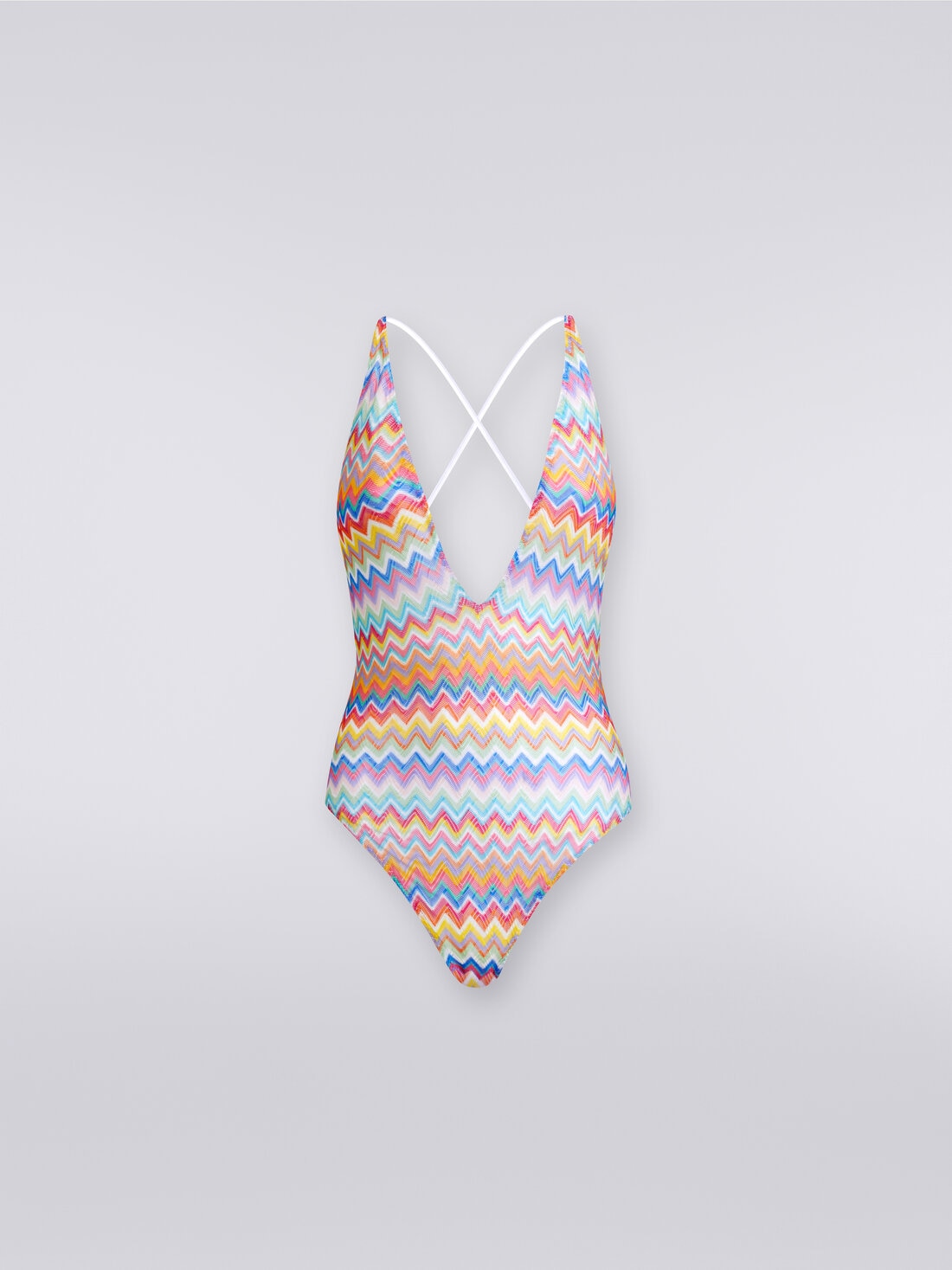 Made of printed raschel fabric, the women's one-piece swimming costume features a plunging V-neckline framing the décolleté and crossed shoulder straps at the back. The piece is enlivened by the zigzag pattern that emphasises its unique design.