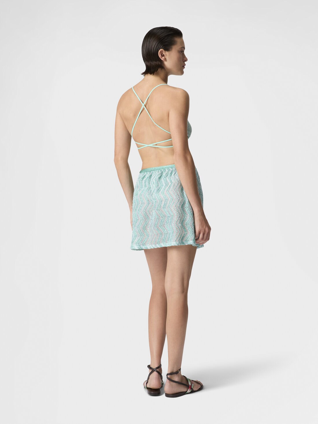 The zigzag motif takes shape in the viscose-blend mesh of this women’s pareo mini skirt, illuminated by sequins that create delicate reflections of light and movement.
