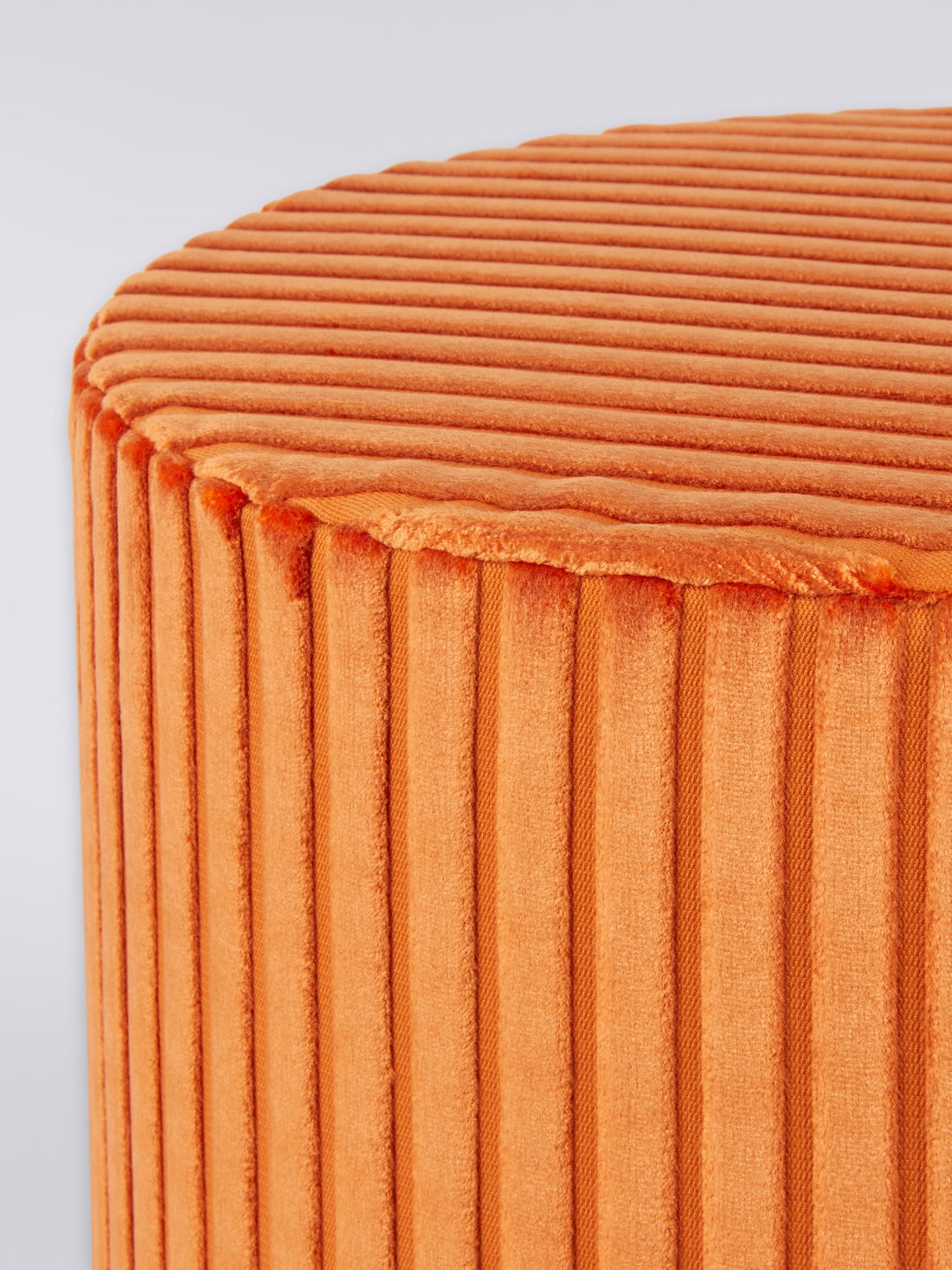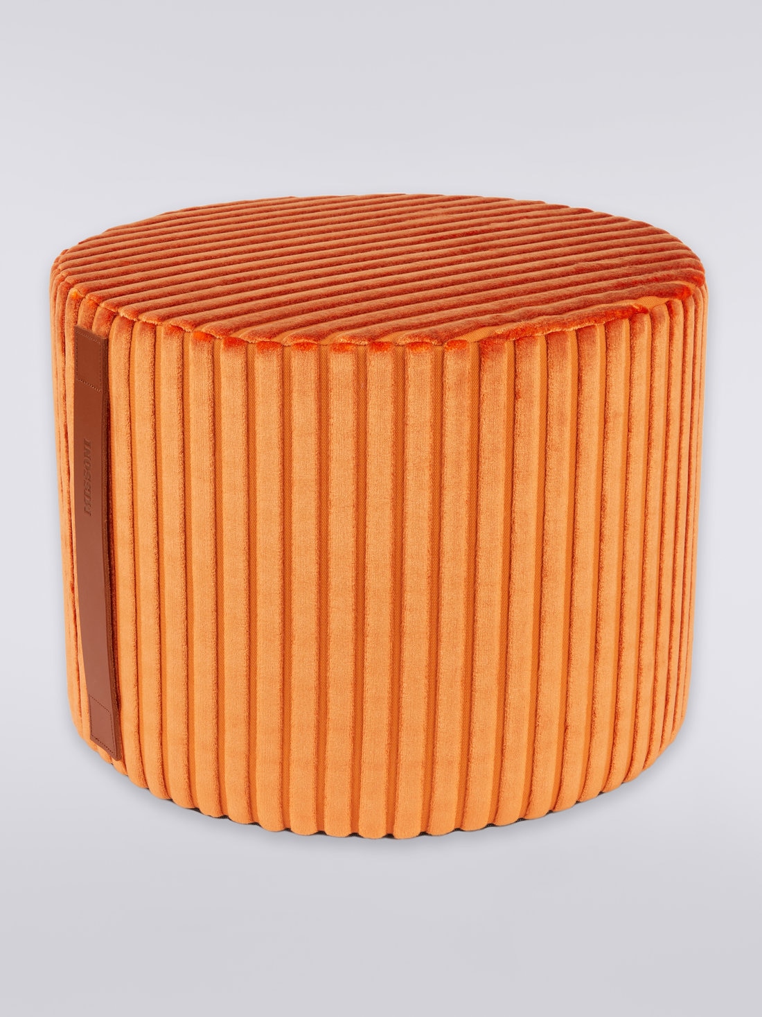 The 40x30 cm Coomba pouffe features a single colour block, interspersed with alternating vertical stripes of solid and opaque patterns, highlighting the materiality of chenille. This home accessory is made easier to move by the logo-imprinted leather handle.