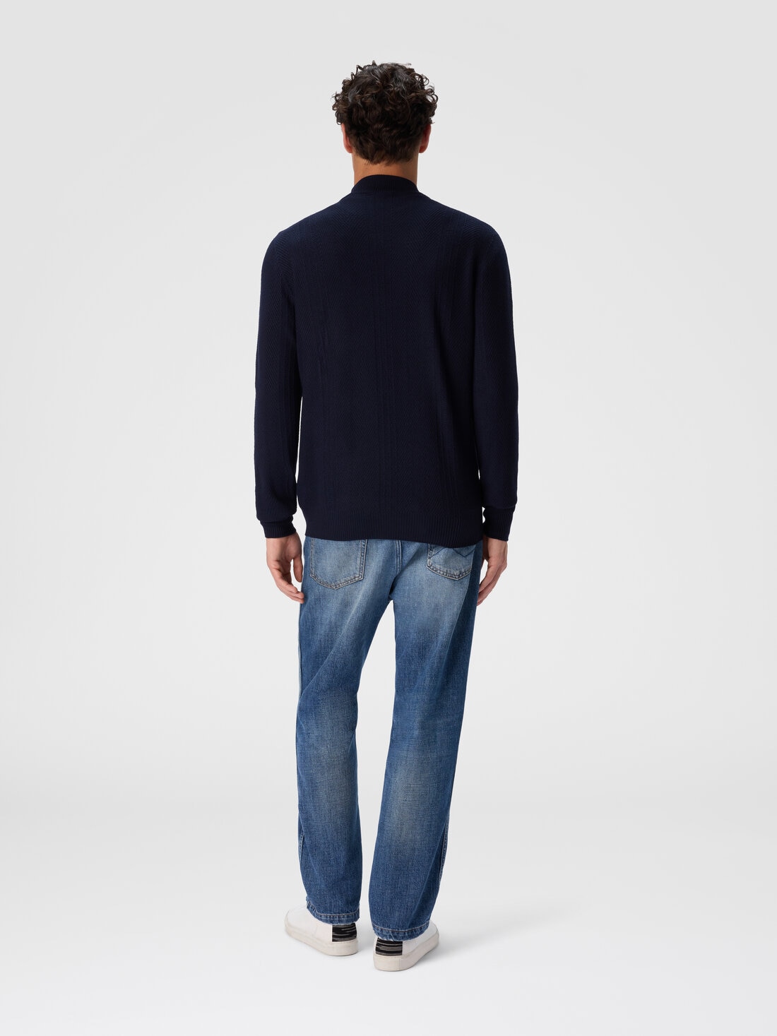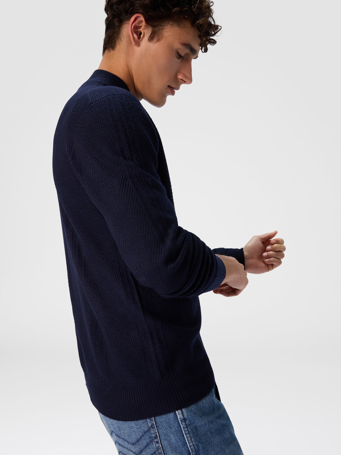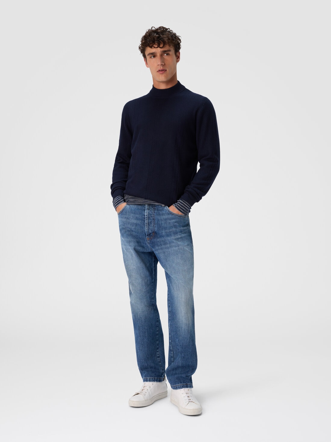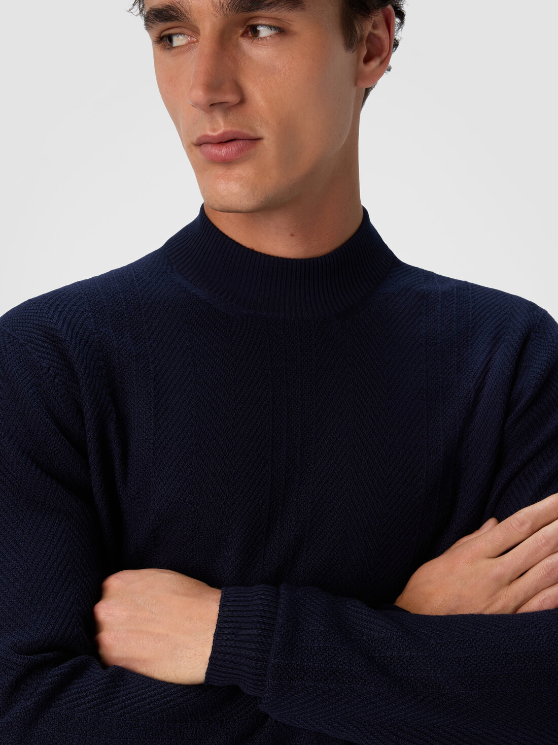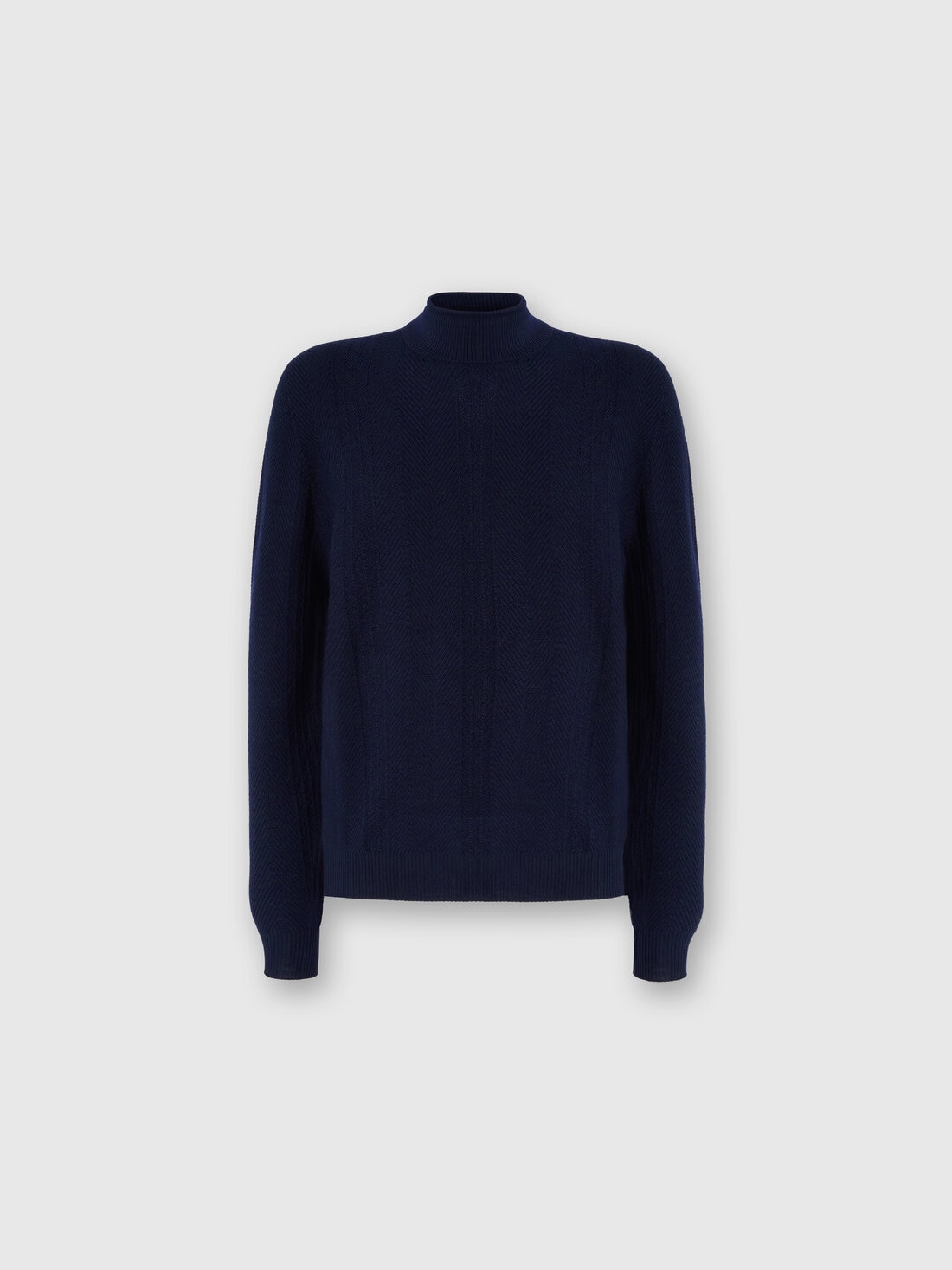 Cozy and refined, this men’s turtleneck sweater in 100% wool is made with sophisticated multi-stitch rice grain workmanship, enriched by a tone-on-tone chevron motif. The elegant design and textured surface create a dynamic visual effect, blending comfort and style in a versatile and characterful garment.