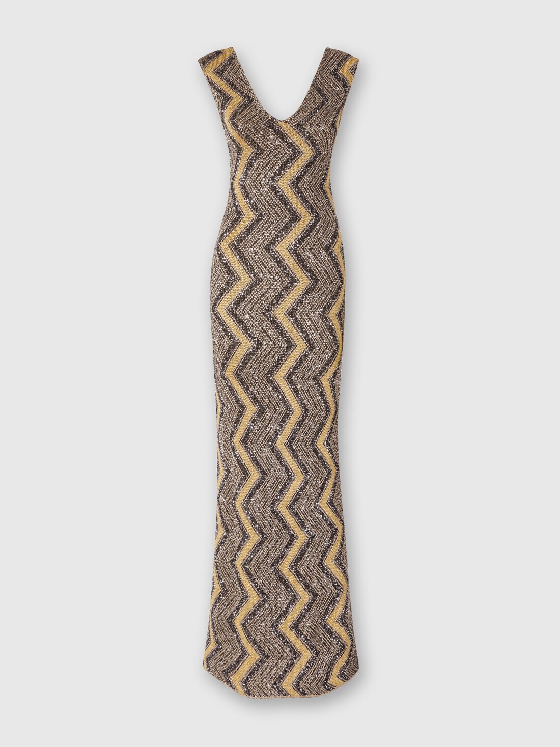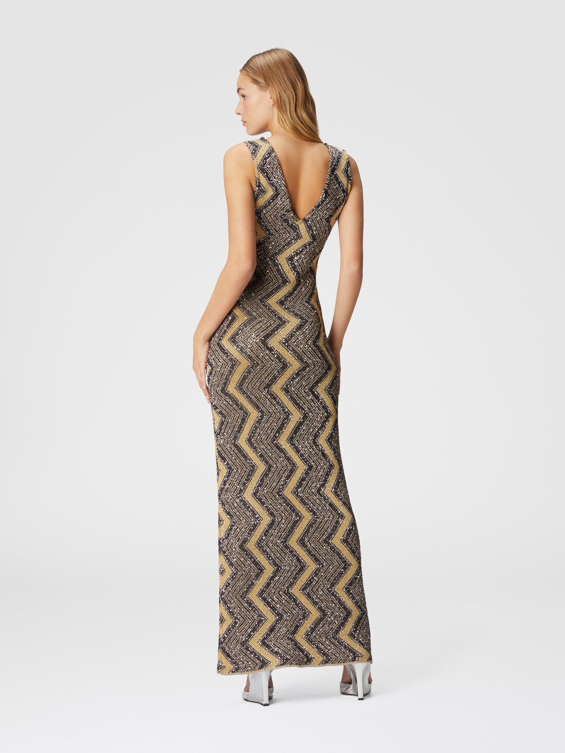 The coarse-grained viscose-blend knit offers the ideal testing ground for the long sleeveless dress. The model with a plunging double-faced V-neckline is embellished with a vertical zigzag design with sequin appliqués.