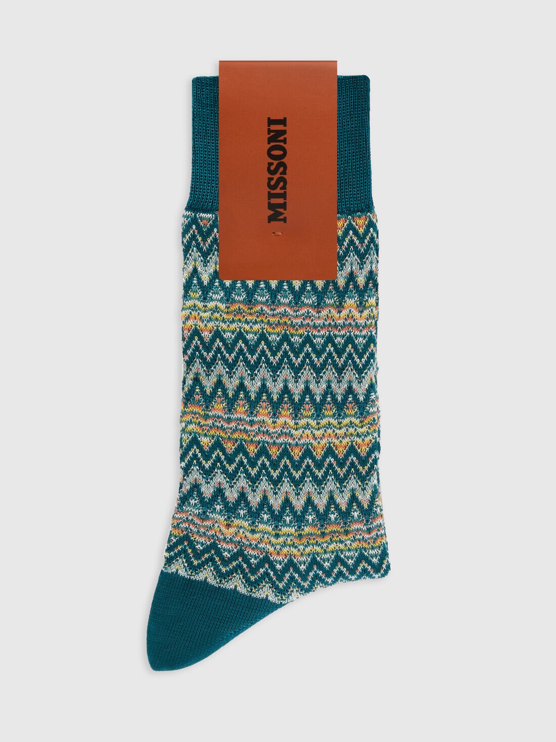 The Missoni men's cotton blend short socks with chevron pattern are a cool addition to the wardrobe. With the brand's classic chevron pattern, the socks offer comfort and timeless style for every occasion.