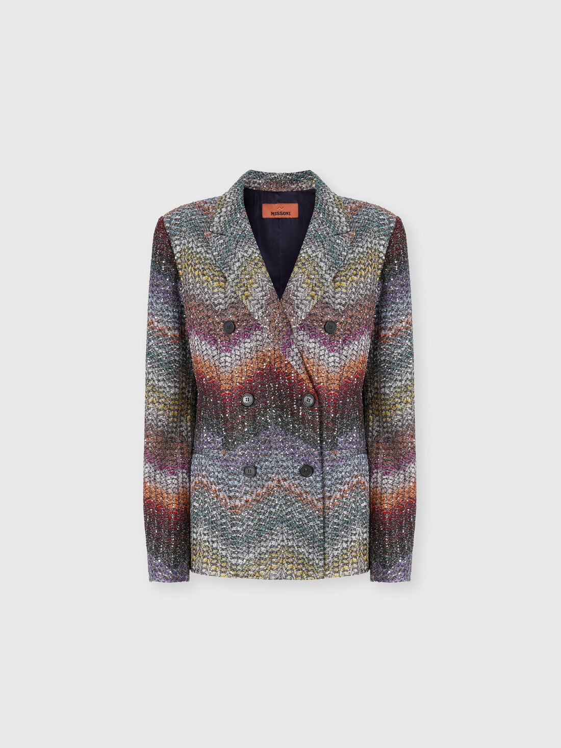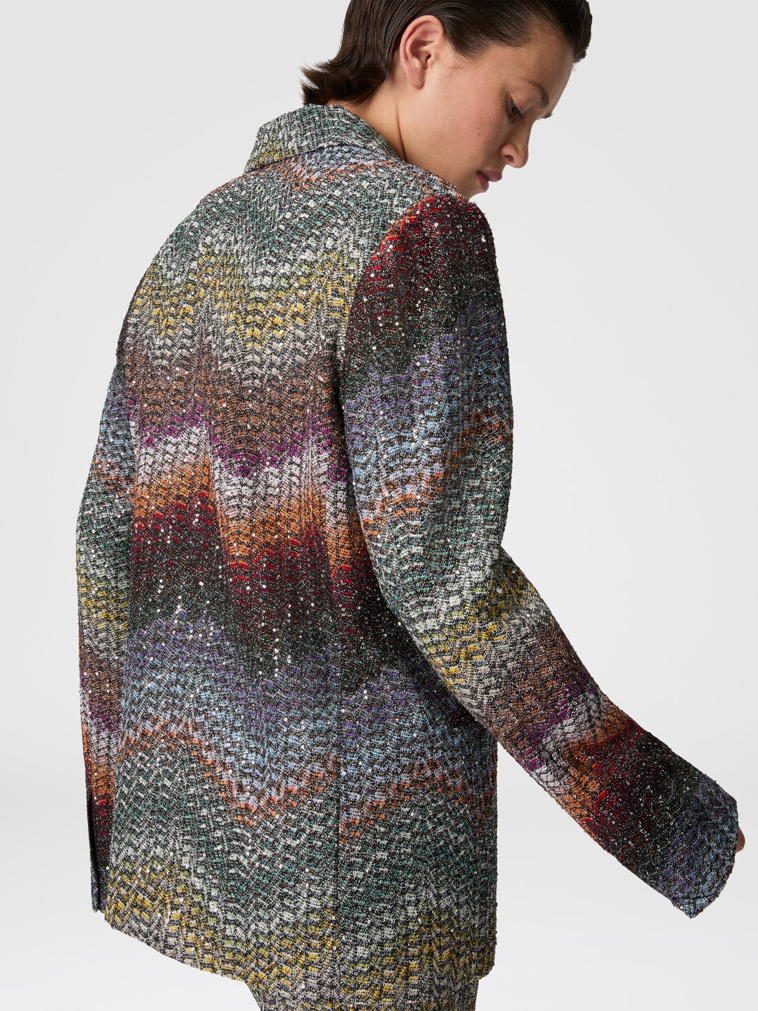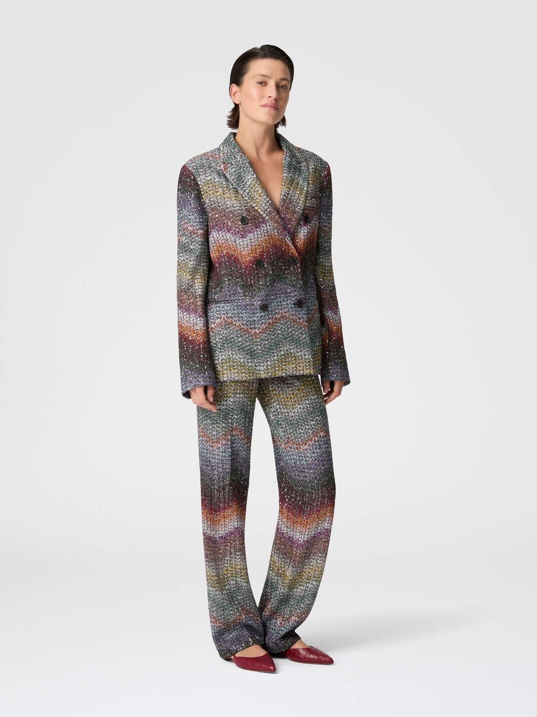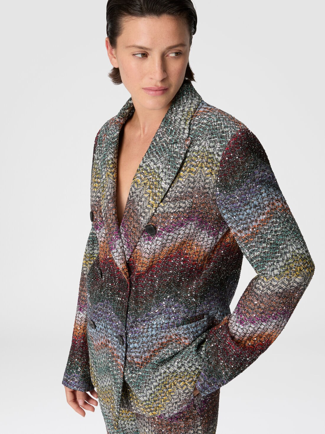 Double-breasted women’s blazer in lamé viscose with sequins, crafted on a Caperdoni loom with a zigzag pattern. The structured cut and graphic motif running through the fabric give the piece rhythm and elegance, turning it into a sophisticated and contemporary interpretation of the maison’s style.