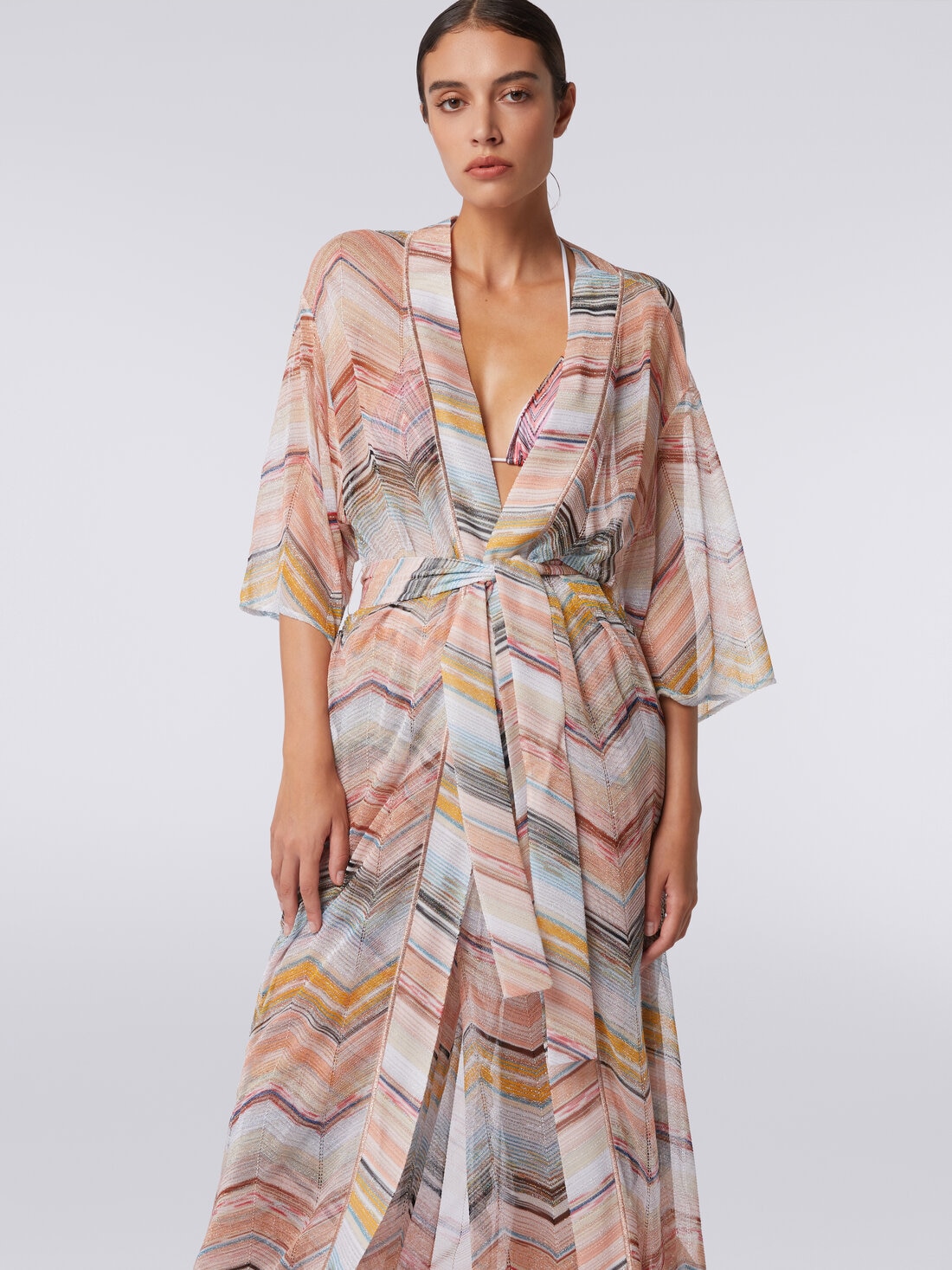 A refined kimono effect for the long cover up to be tied at the waist with a belt. The short-sleeved piece, embellished with the touch of lurex, is made of viscose blend knit with large zigzags.