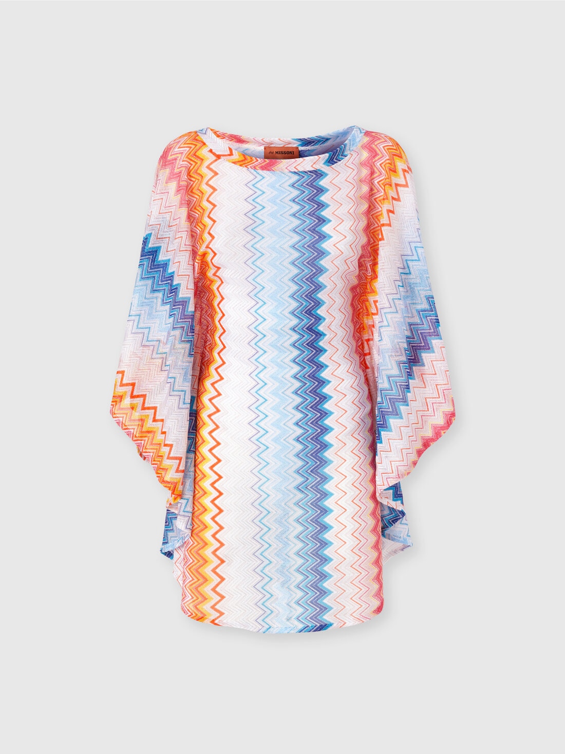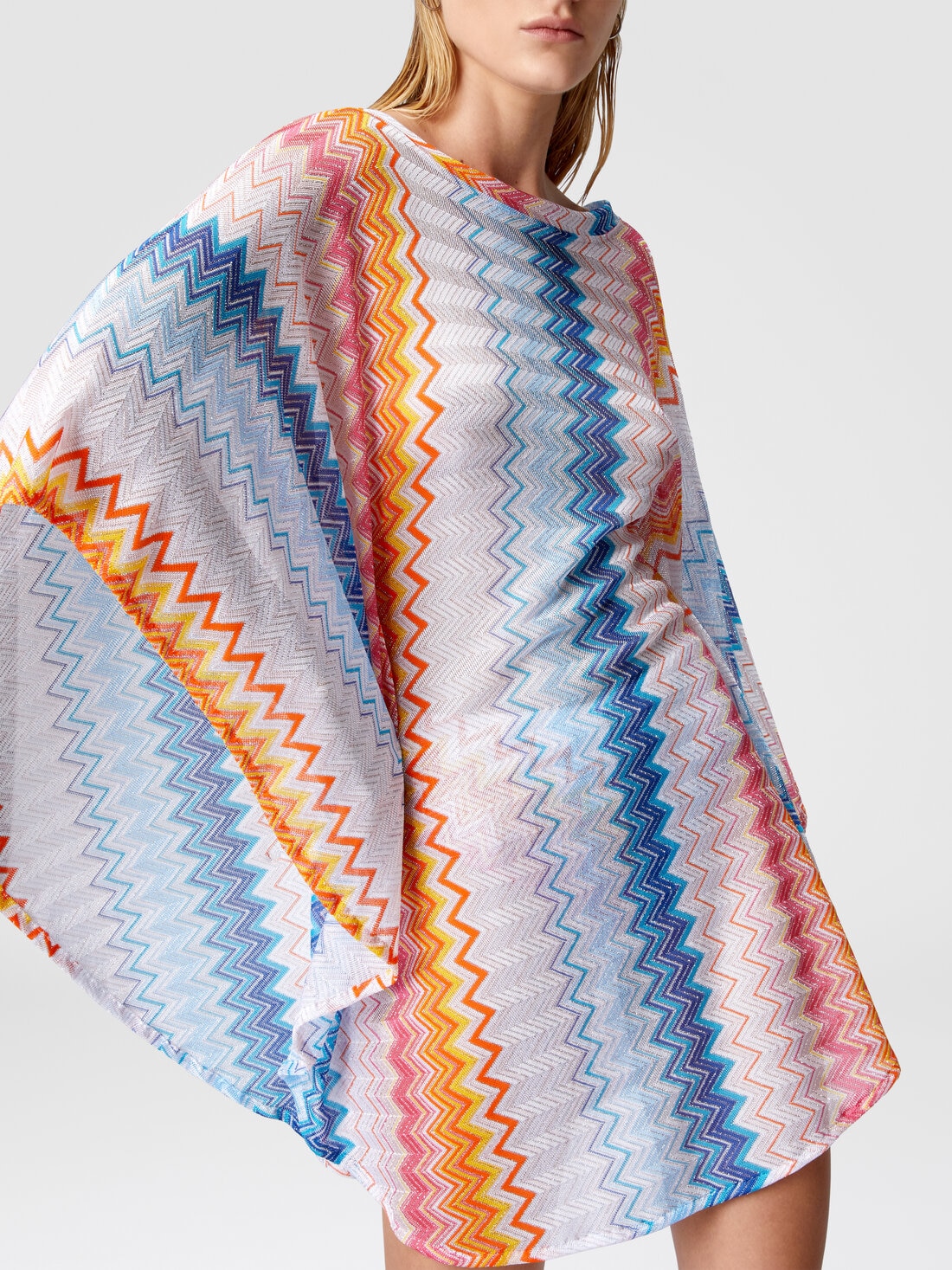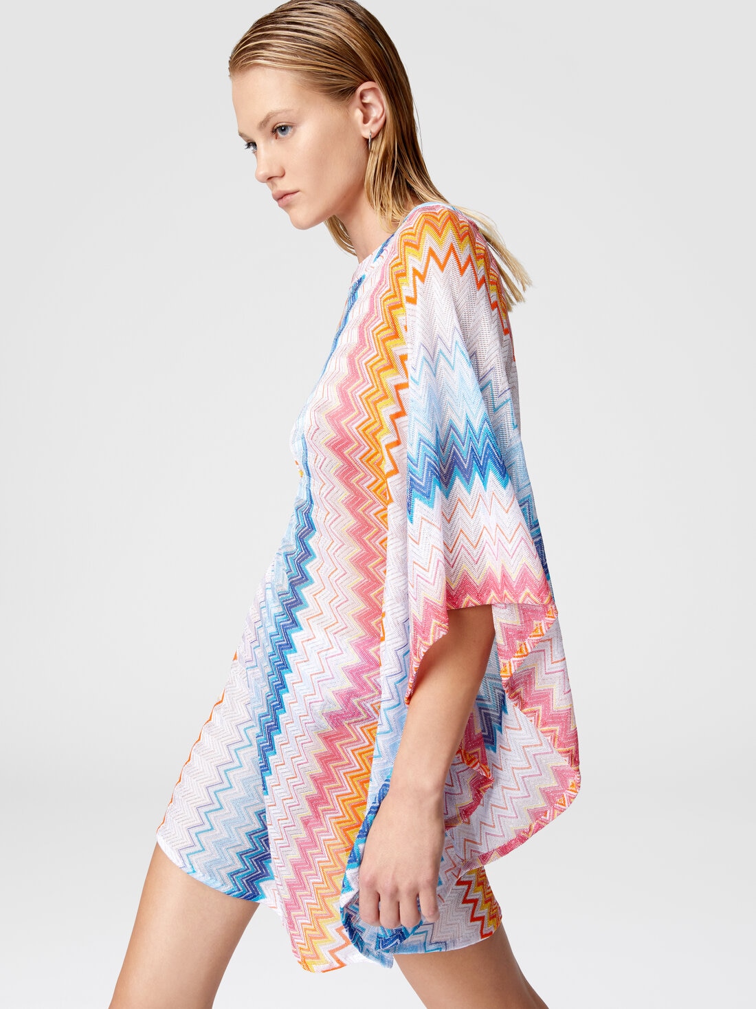 Play with transparencies and metallic reflections in this short cover-up caftan in viscose and lamé blend, enriched with the classic zigzag motif. The wide batwing sleeves give a fluid elegance, while the V-neckline and the soft line give lightness and refinement. A garment that embodies the heritage of the maison, bringing the unmistakable sophisticated and timeless aesthetic of Missoni to the beach.