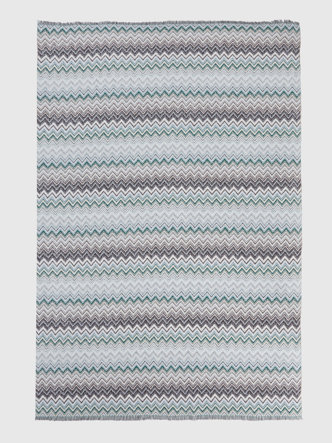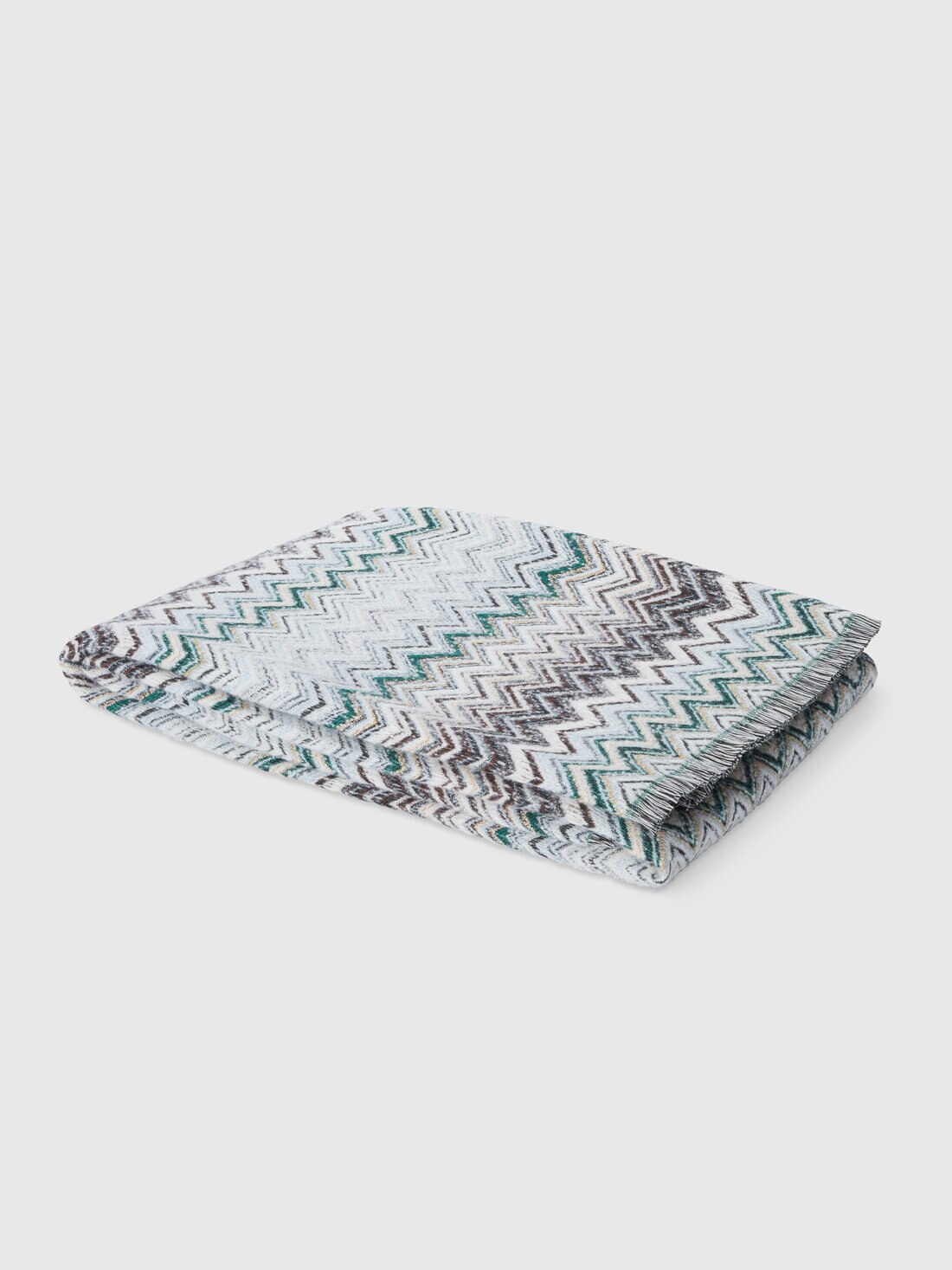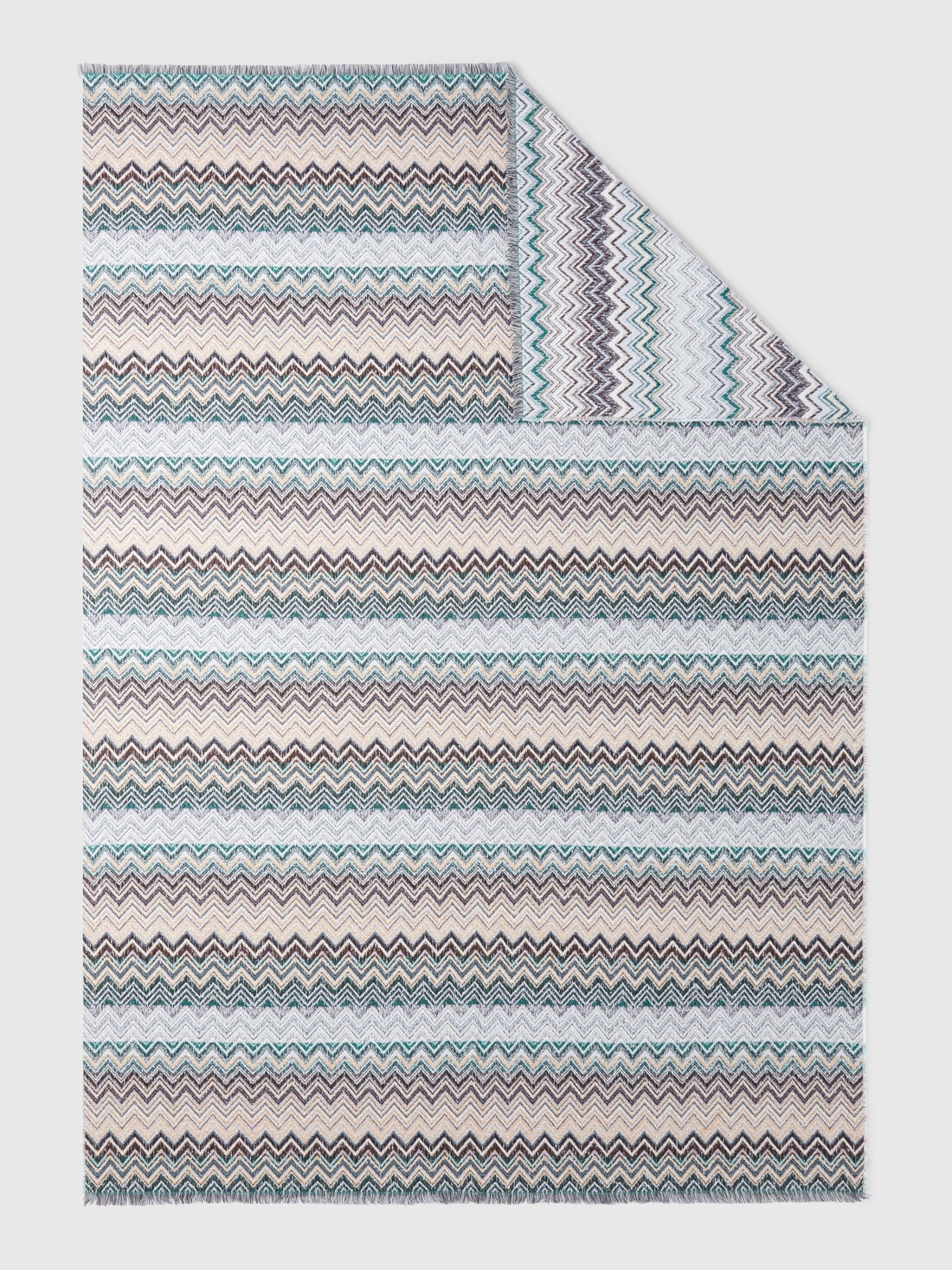 The 130x195 cm cotton-wool blend plaid blanket is made of a refined blend of materials, enriched with a hint of cashmere for an extra touch of softness. Characterised by the chevron pattern, the blanket is further embellished by the fringed edges, which add a touch of elegance and sophistication.