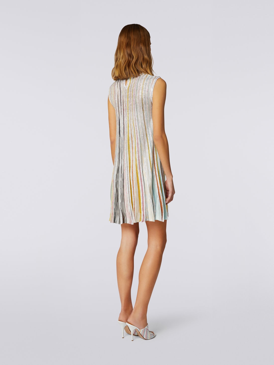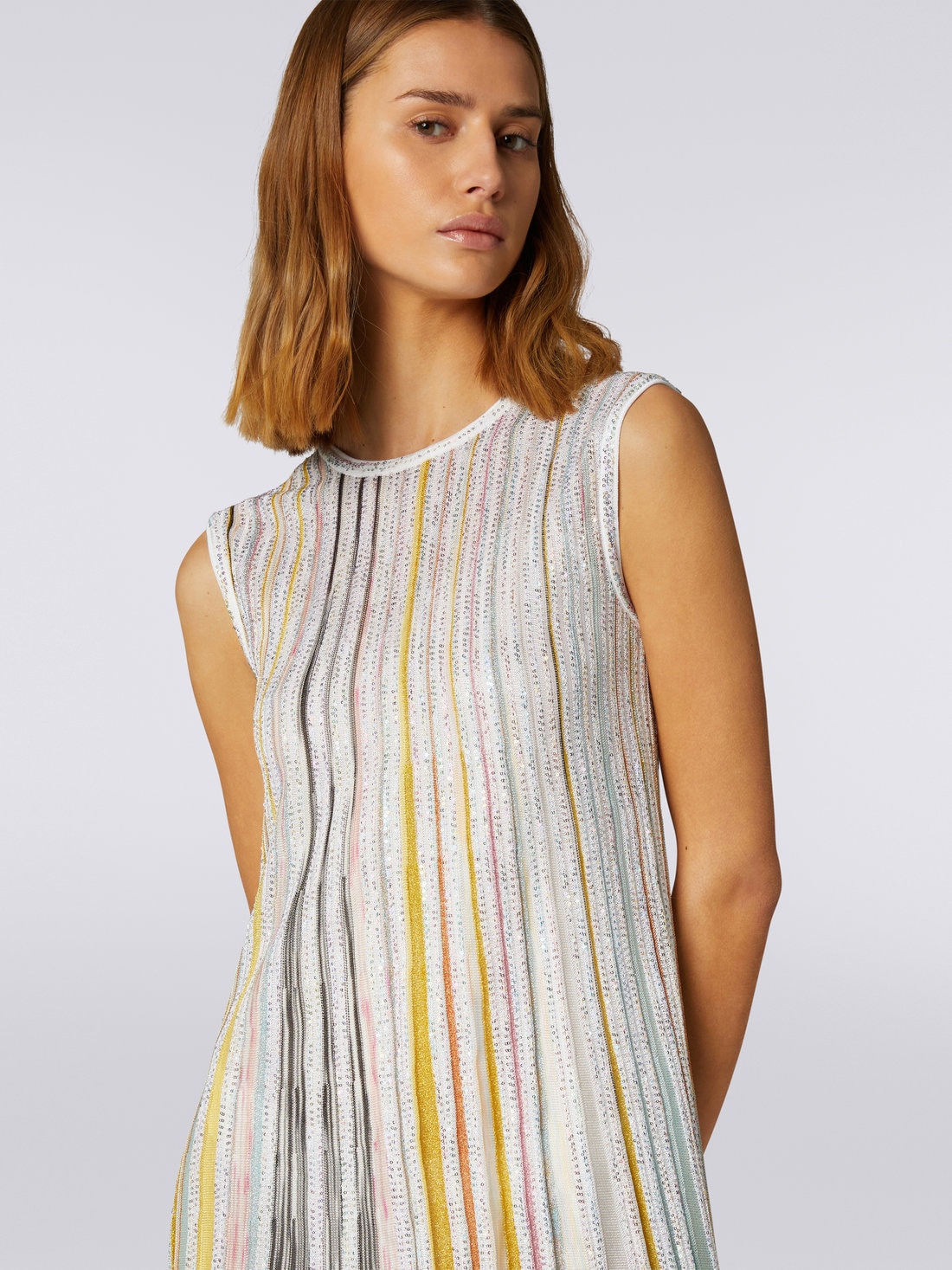 Love at first sight is guaranteed with the sleeveless women’s minidress. Twenties inspiration and contemporary taste characterise the entirely pleated crew-neck piece with flared bottom, multicoloured vertical stripes with lamé threads and sequin appliqués.