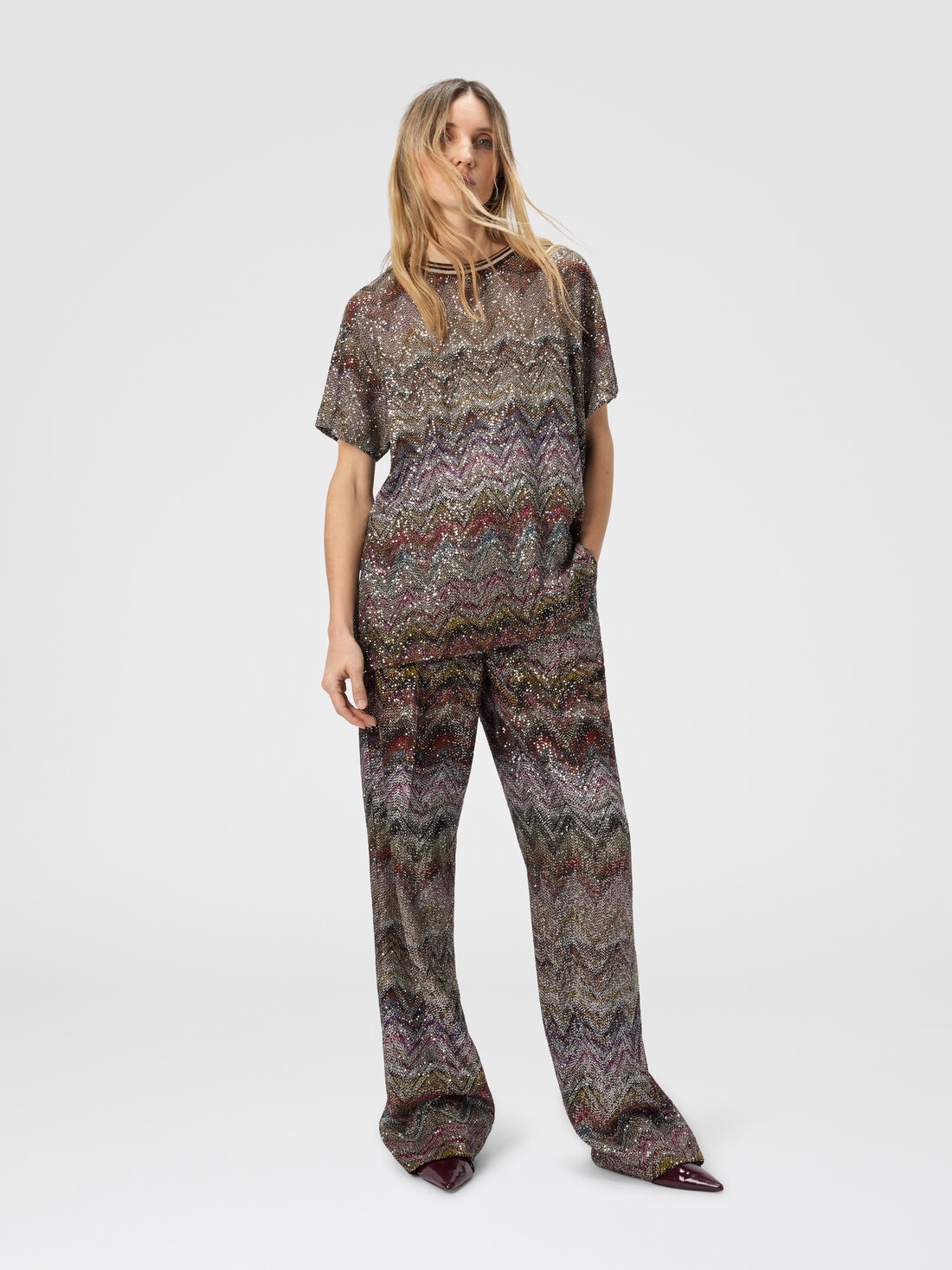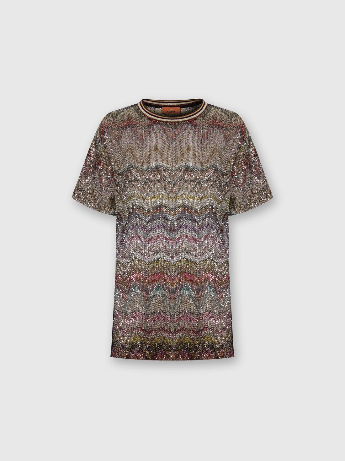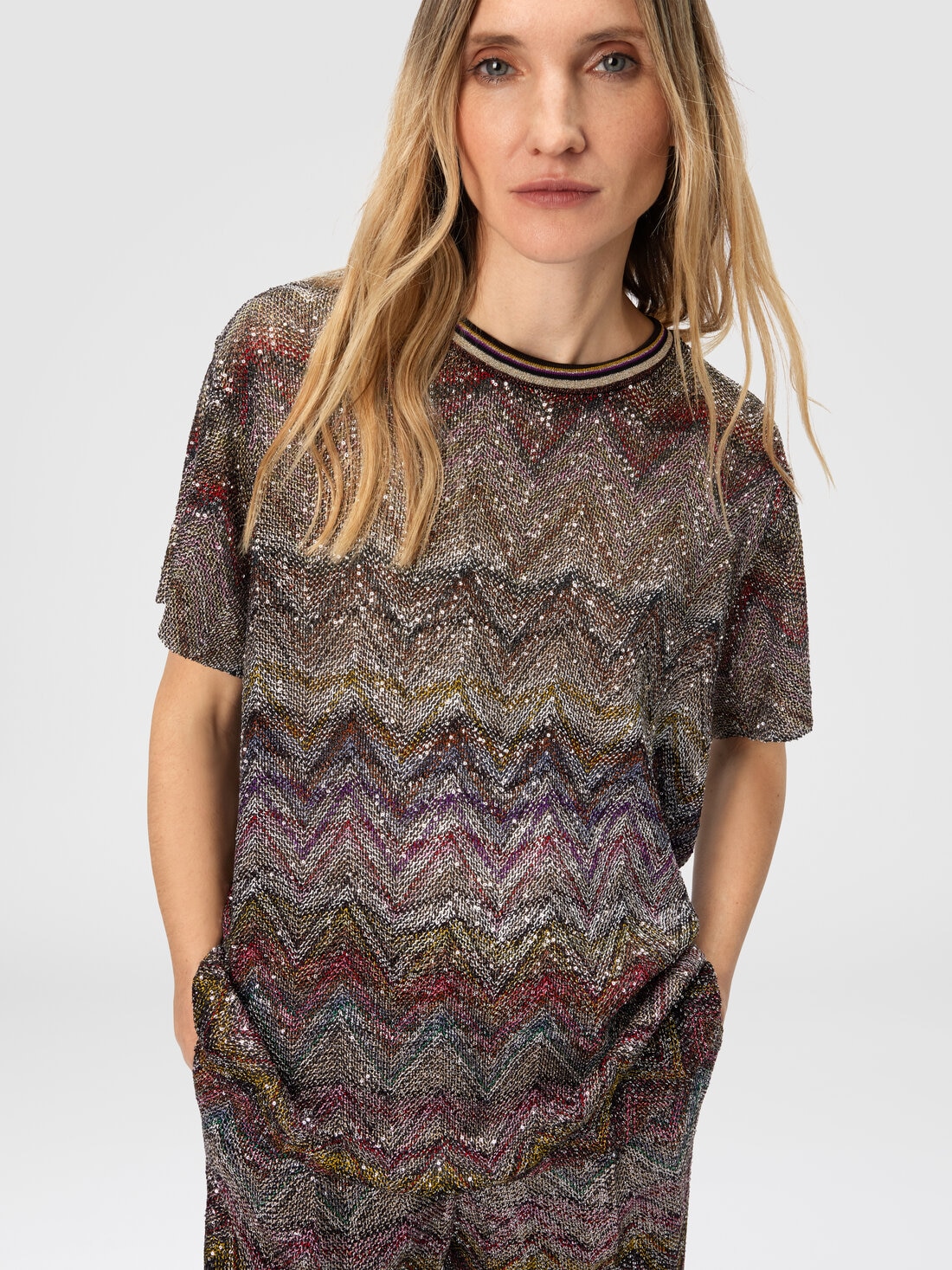 Short-sleeve women’s T-shirt with luminous and sophisticated character, made on a Caperdoni loom with Missoni’s iconic zigzag motif. The lamé threads and delicate sequins give the garment a subtle brilliance, perfect for elevating even the simplest looks with a touch of light.