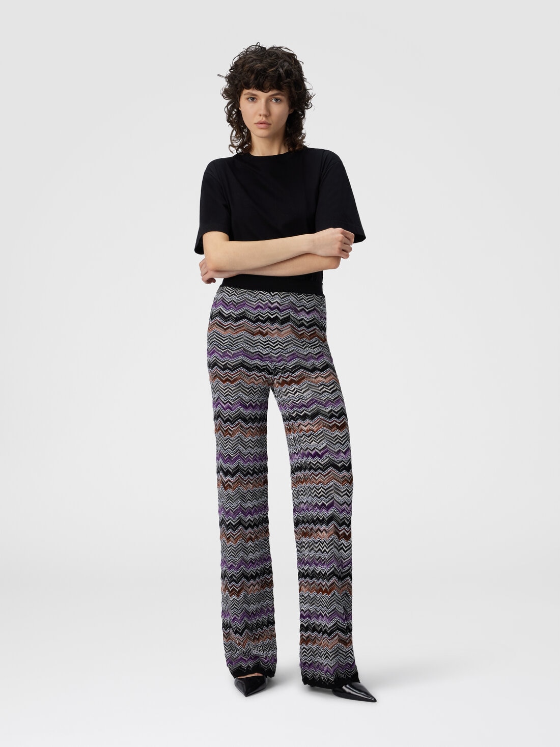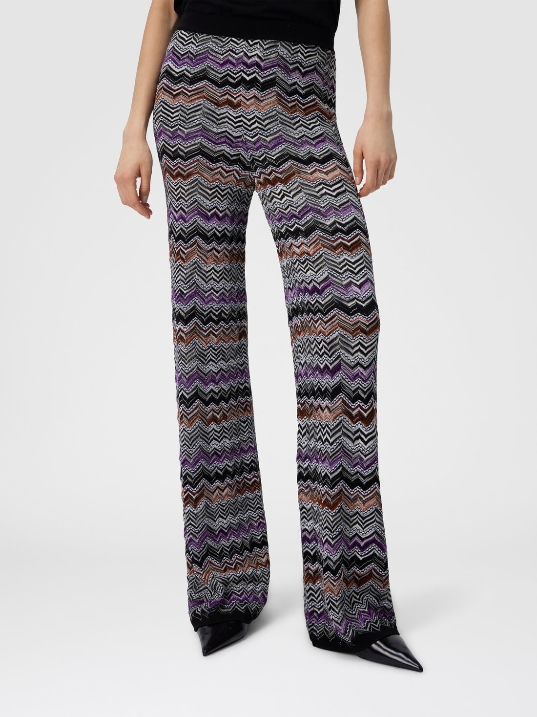 A straight-leg long women’s trouser that celebrates the iconic Missoni chevron, reinterpreted in slubbed English rib knit. Made from viscose and cotton blend, it combines a structured texture and graphic movement for a distinctive and contemporary look.