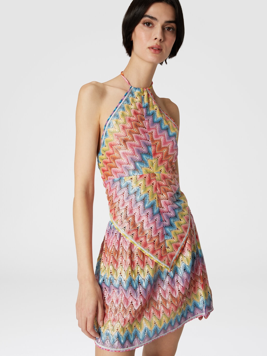The handkerchief top in coated cotton-blend lace with raschel workmanship encapsulates all the vibrant energy of Missoni's DNA in a single garment. The scarf-cut style leaves the back uncovered, is finished with contrasting piping and features a ribbon to tie behind the neck.