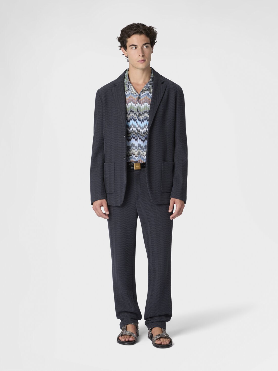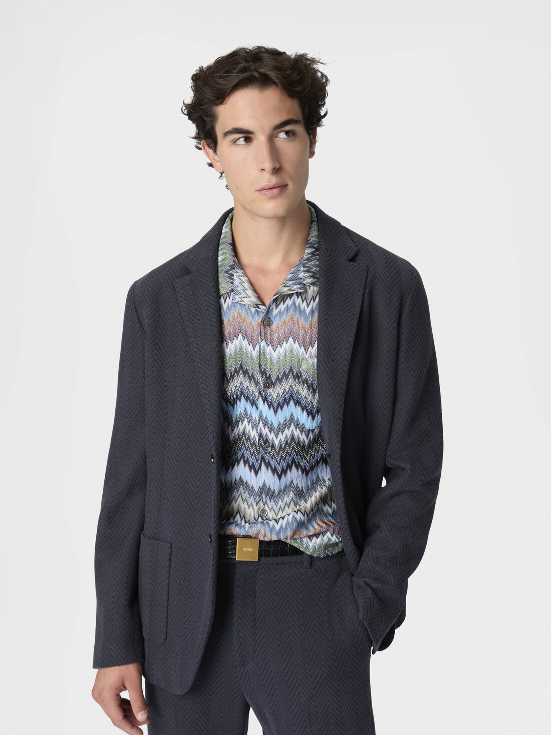 The zigzag pattern that animates the surface of the jacket is what makes this men’s single-breasted blazer instantly recognizable. Made from cotton and viscose with raschel workmanship, the piece expresses the unmistakable identity of the Maison through a refined tactile effect and a tone-on-tone texture of great elegance.