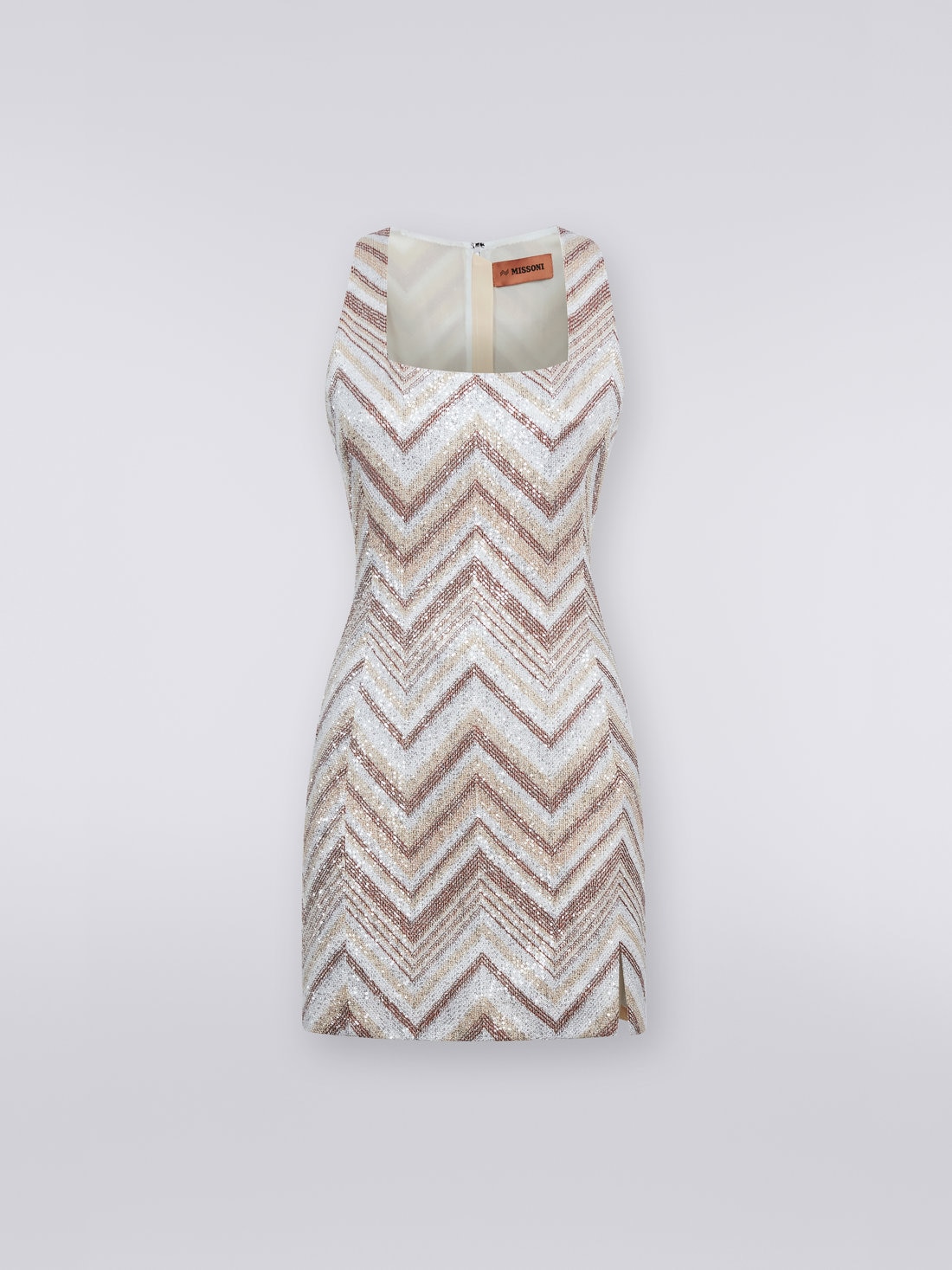 Caperdoni chevron work and iridescent sequin appliqués for the women’s sleeveless minidress. Featuring a refined square neckline, the garment is made of a viscose blend.