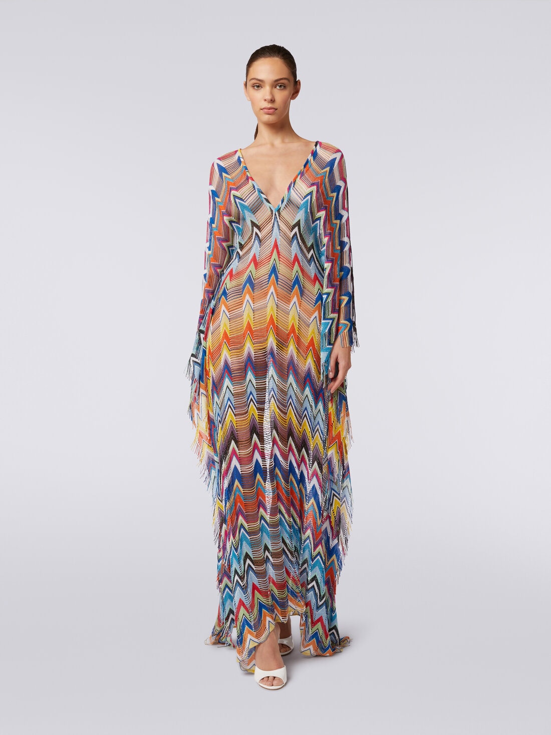 The women's long cover-up is made of a light viscose knit with lurex enriched by an alternating zigzag pattern with fringes. A kaftan model, the garment impeccably expresses the spirit of freedom of days at the beach, offering a relaxed but still very elegant look.