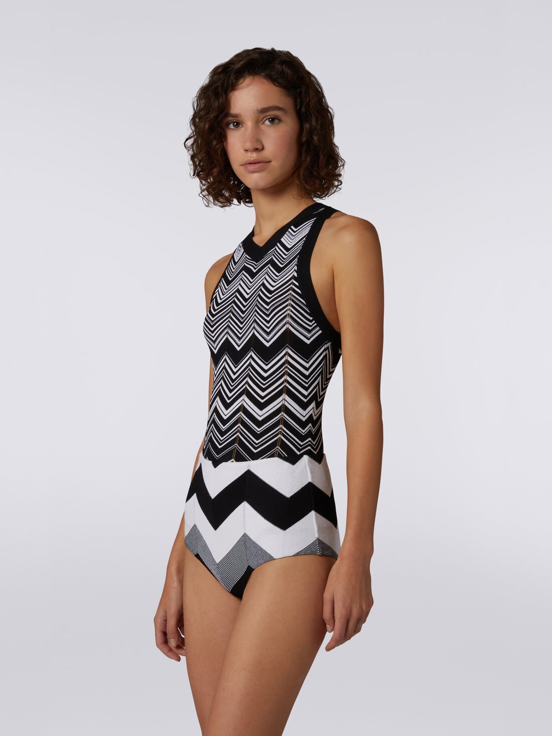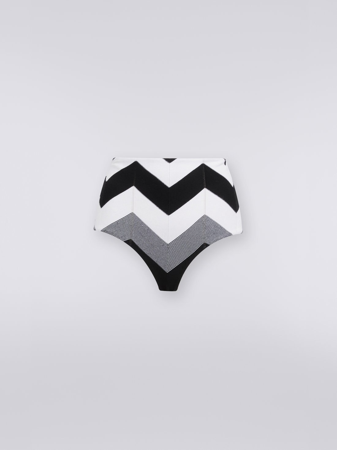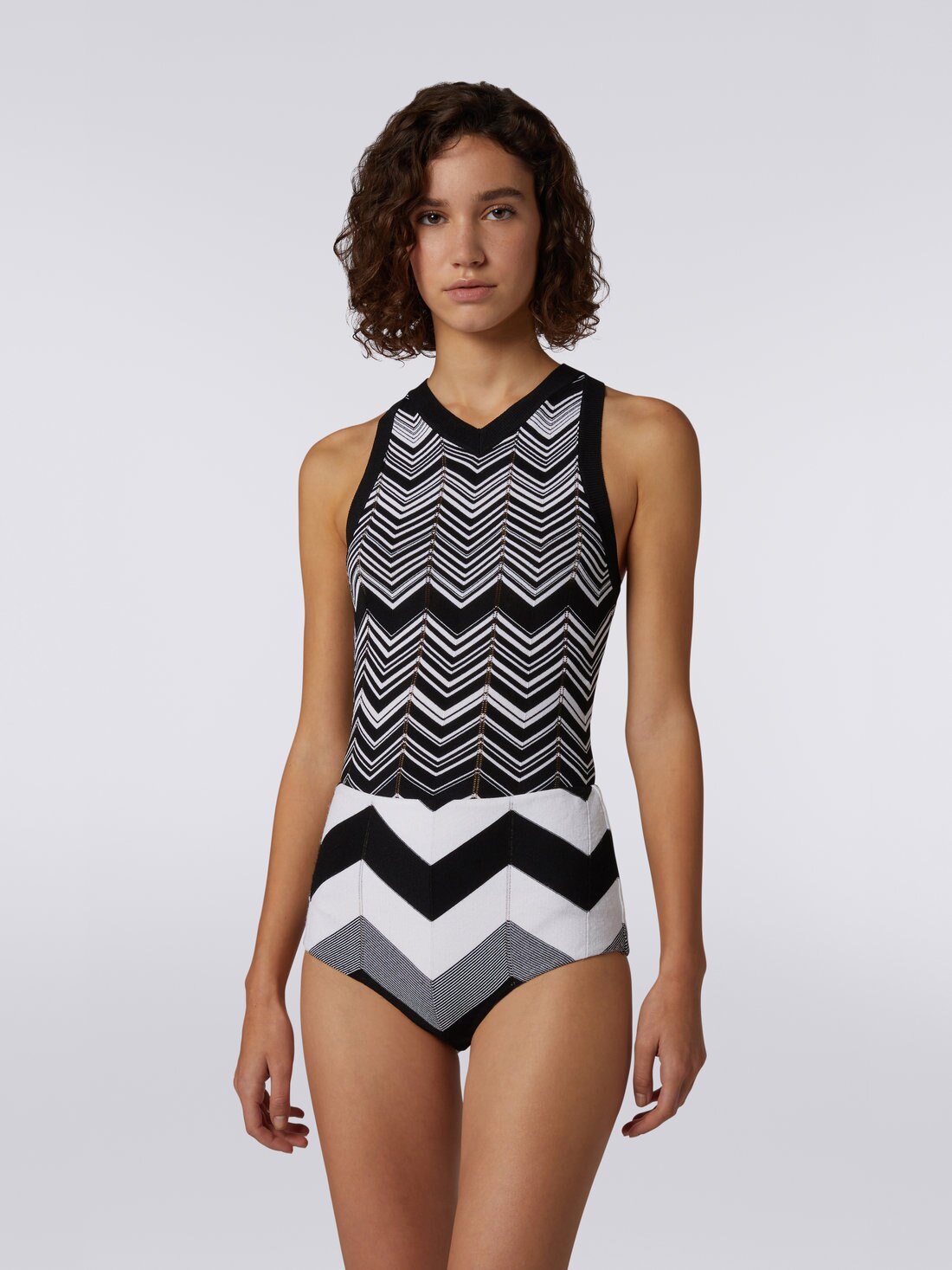 Entirely covered by the large chevron pattern, which plays with a two-tone optical effect, the women’s culotte trousers are made of a viscose blend and feature a high-waisted design that enhances the body’s silhouette.