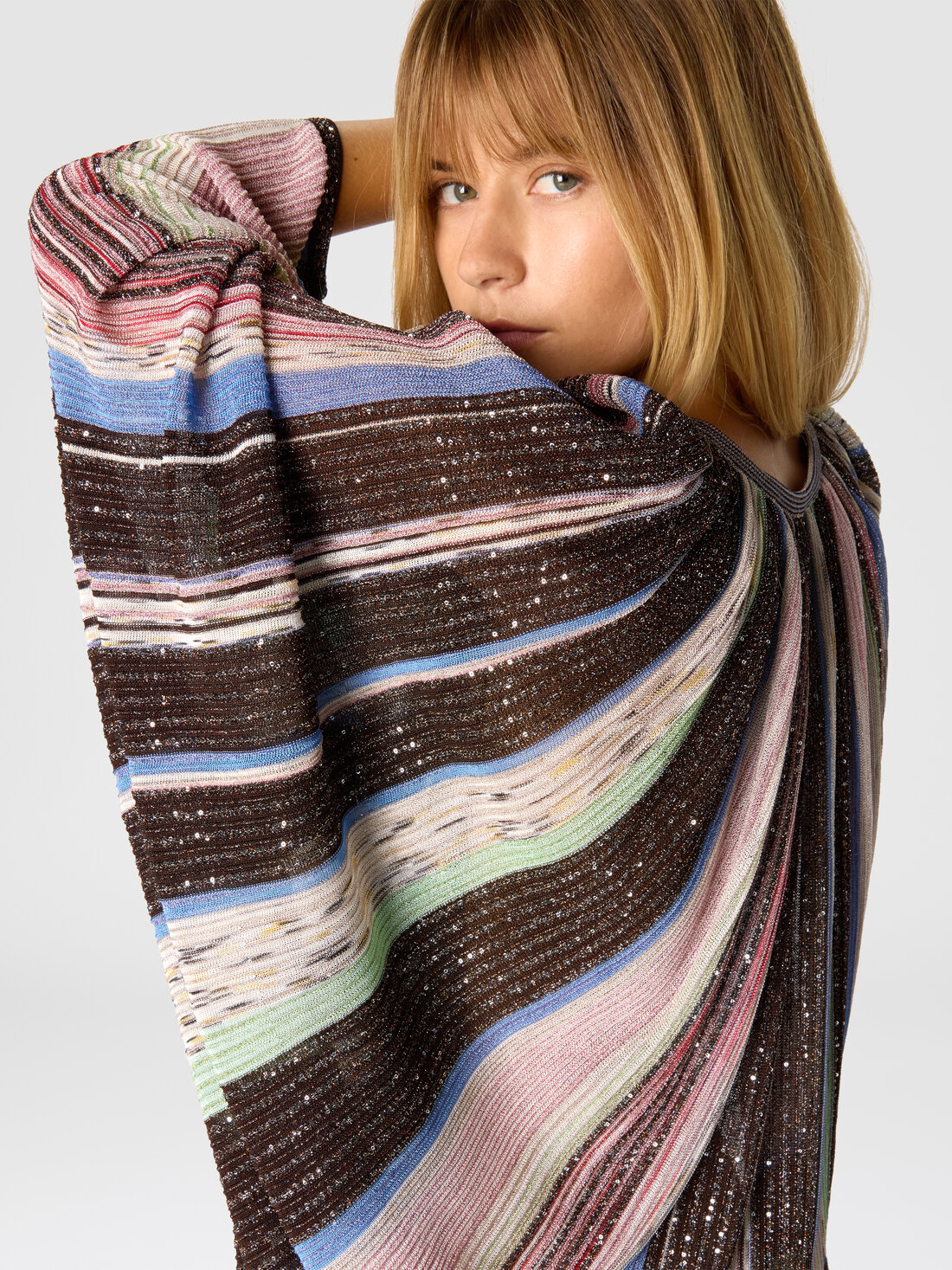 A long women’s caftan with a sophisticated cape effect, crafted from ribbed viscose lamé blend. The fluid lines and luminous texture merge into a light, enveloping piece that expresses an effortless and contemporary femininity.