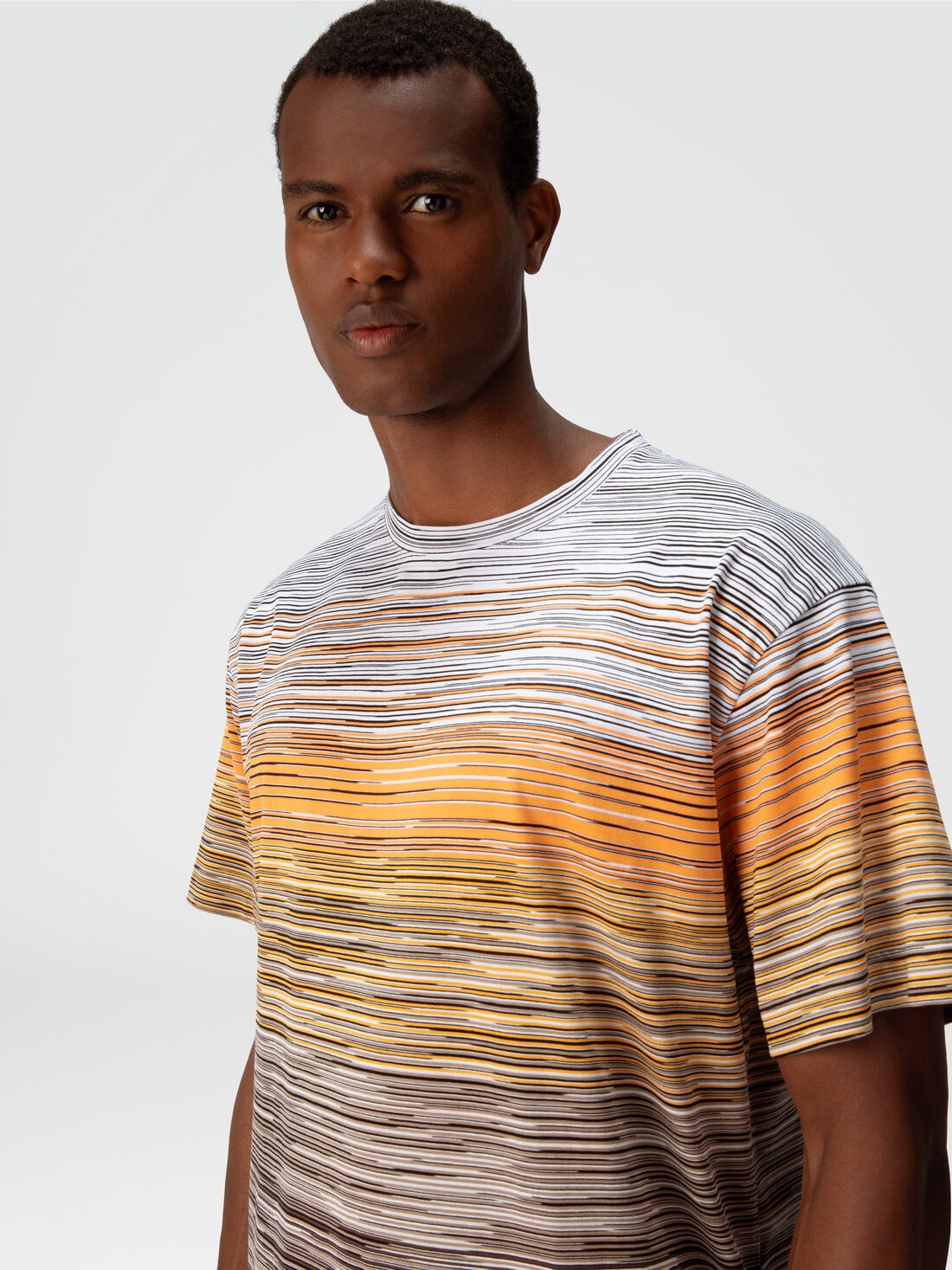 The crew-neck t-shirt is offered with a very Missoni variant: in shaded slub jersey and with a logo print on the back.