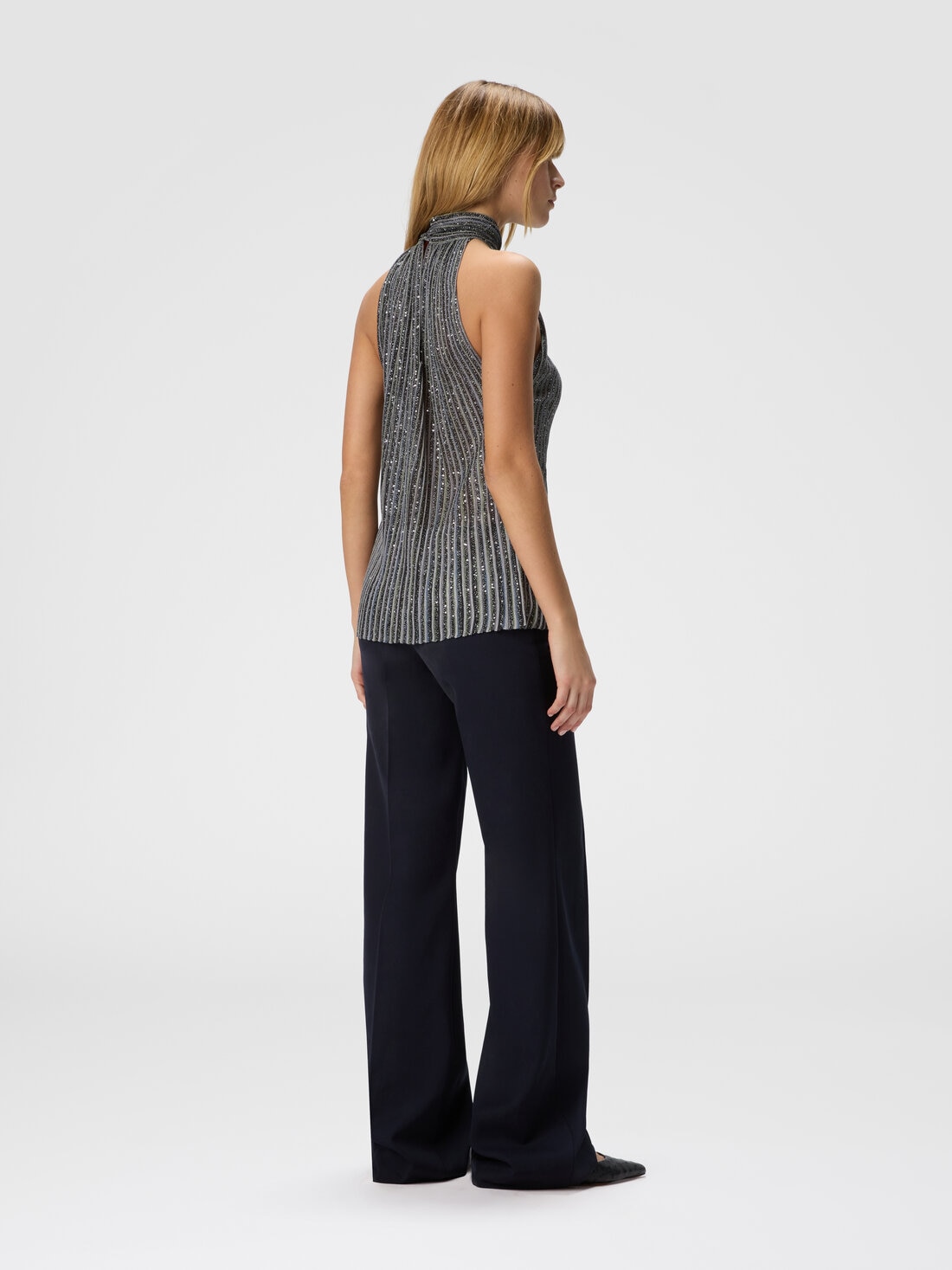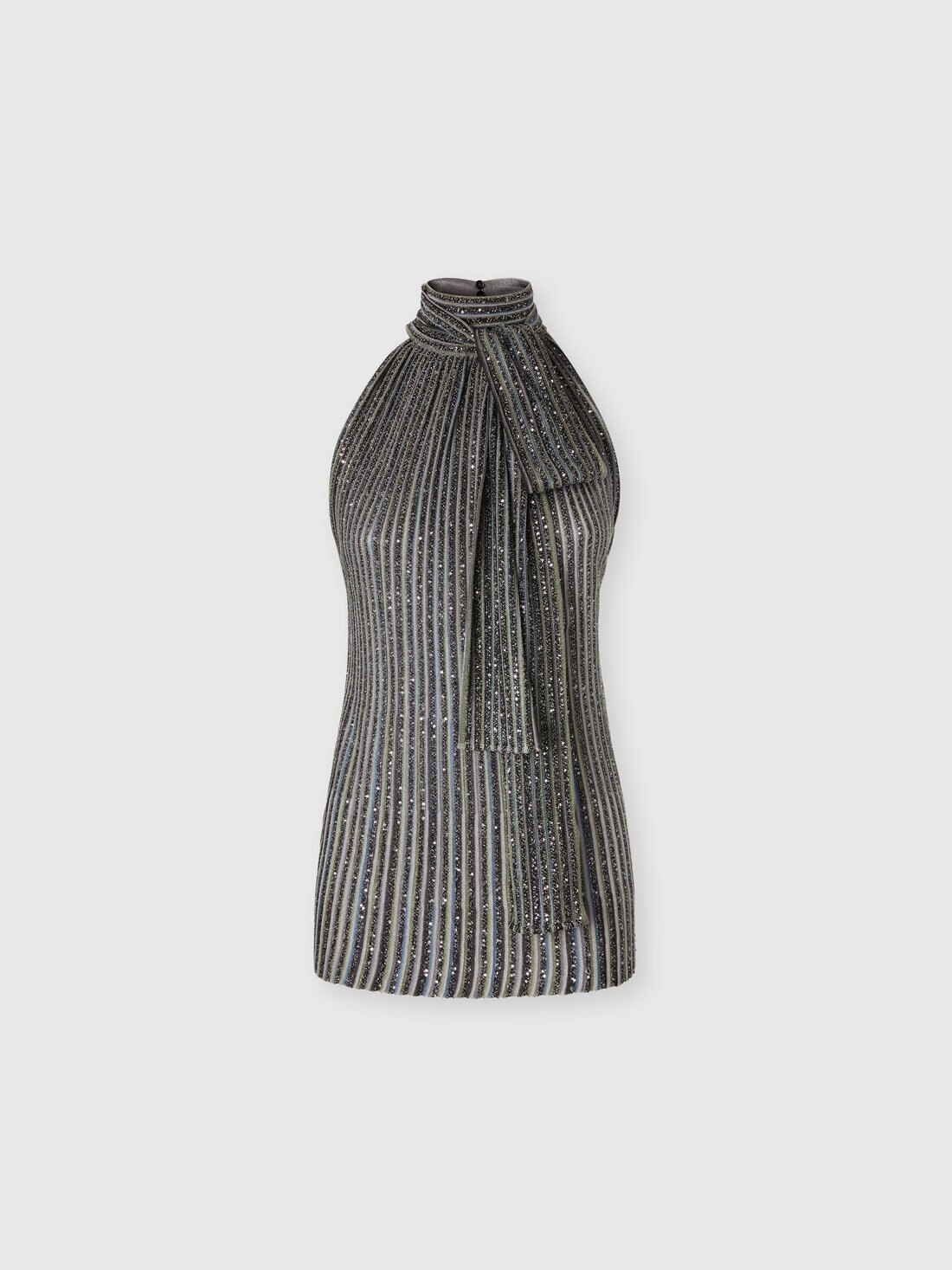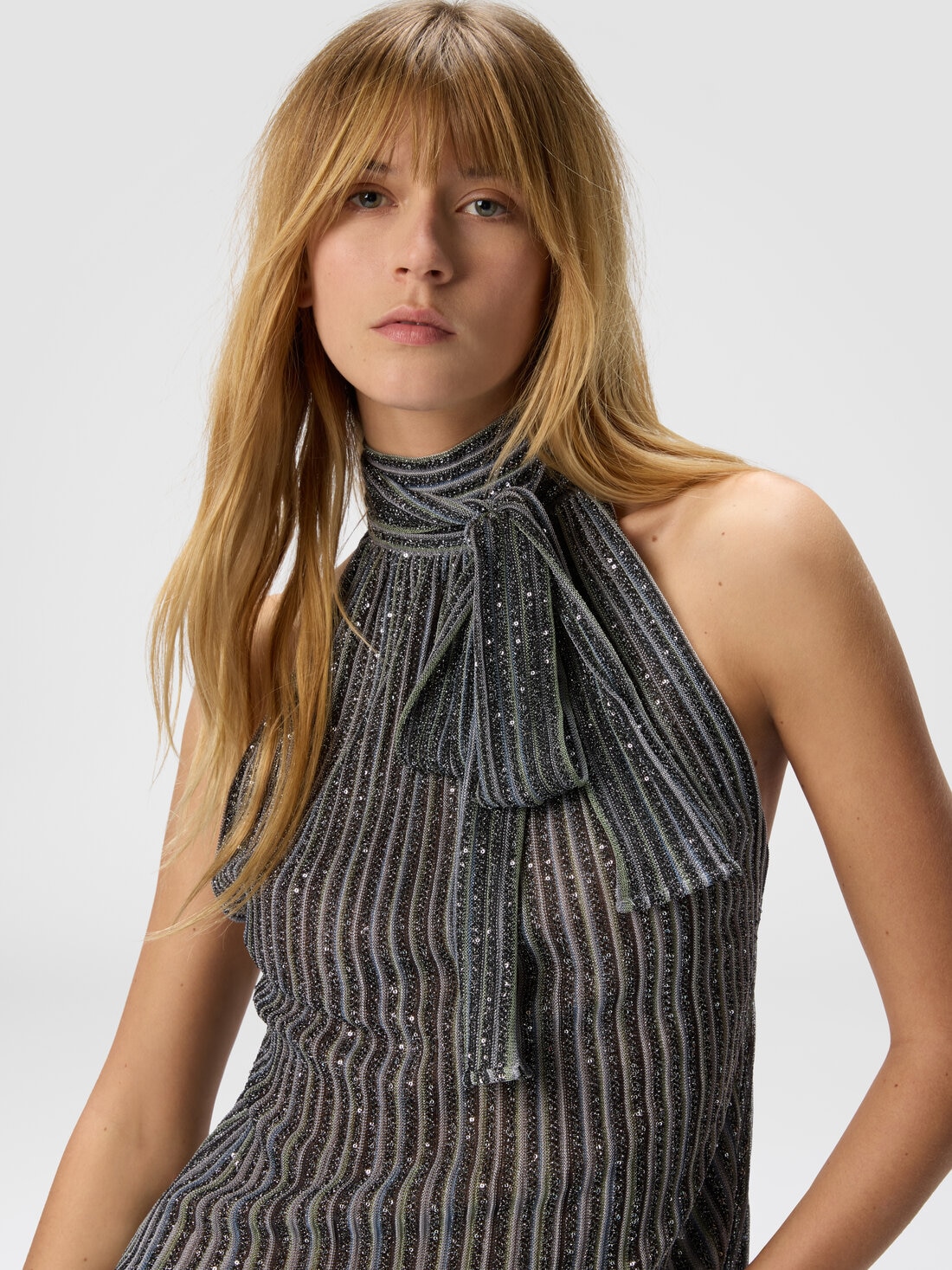 A tribute to Missoni’s mastery, this sleeveless women’s top with a necktie bow embodies the brand’s timeless elegance. Crafted in partially open striped knit in a viscose blend with sequins and lamé threads, the piece plays with texture and light to create a luminous, refined effect. The necktie bow adds femininity, while the openwork knit structure strikes a perfect balance between lightness and structure.