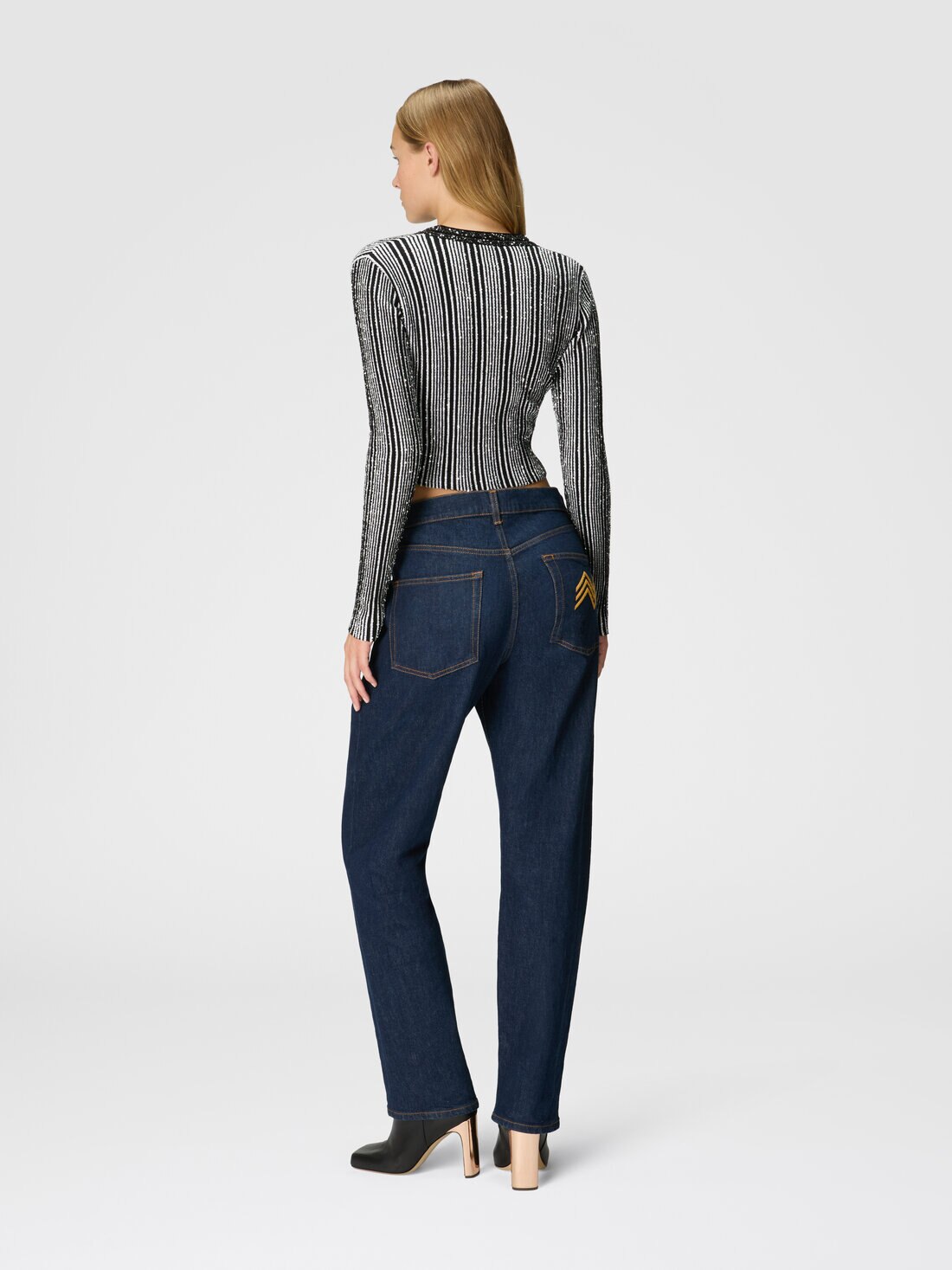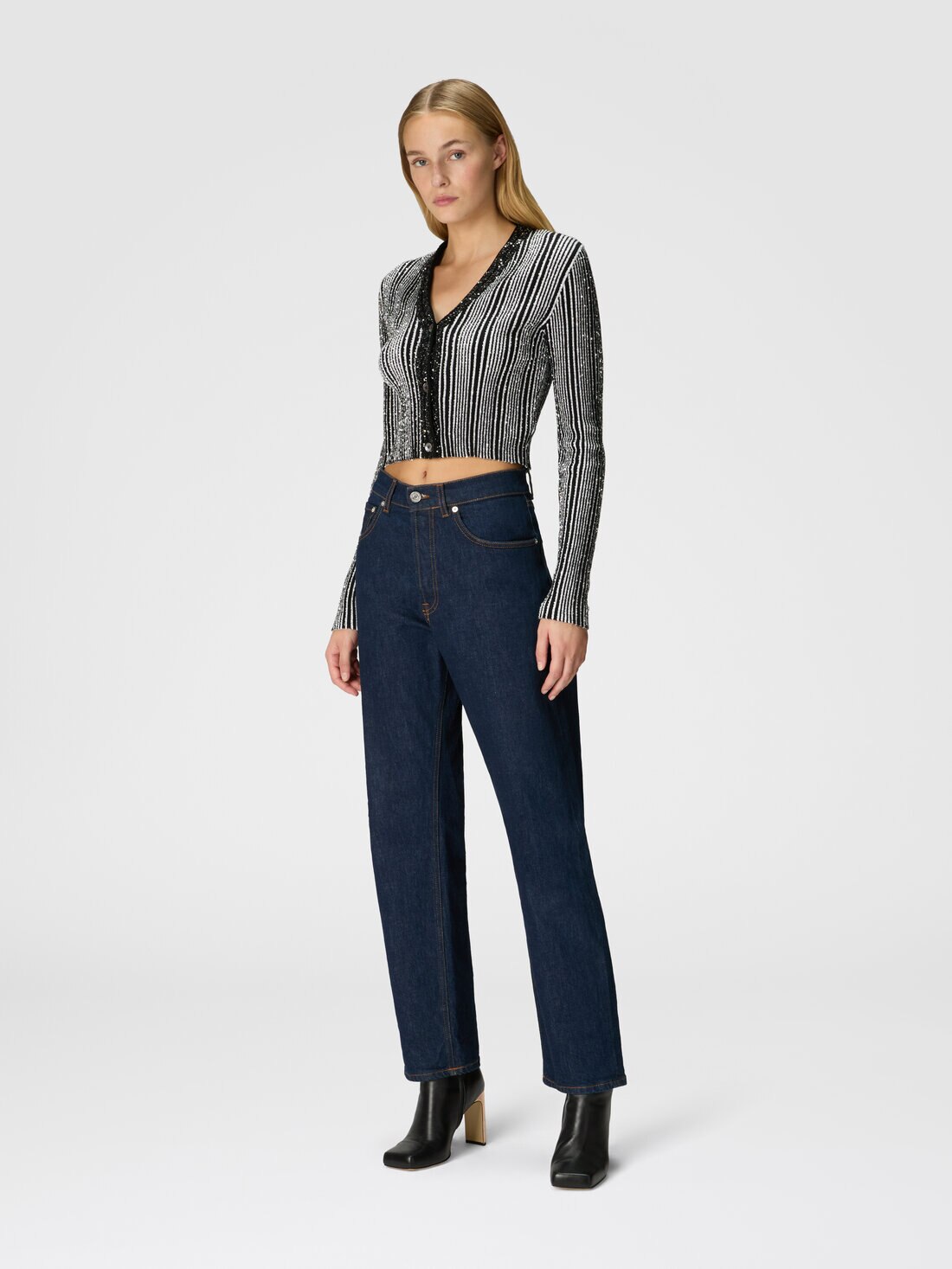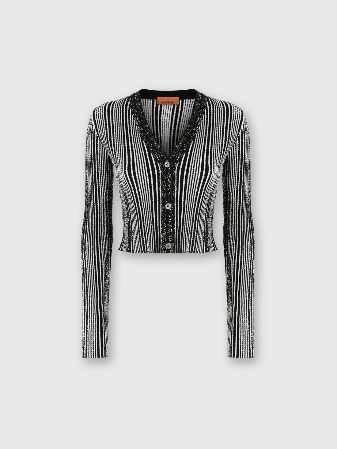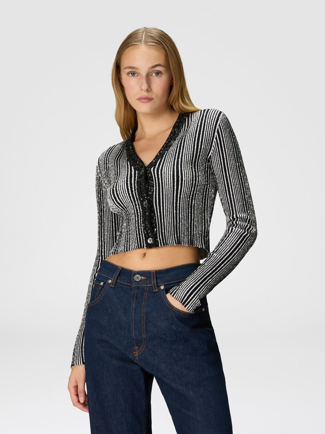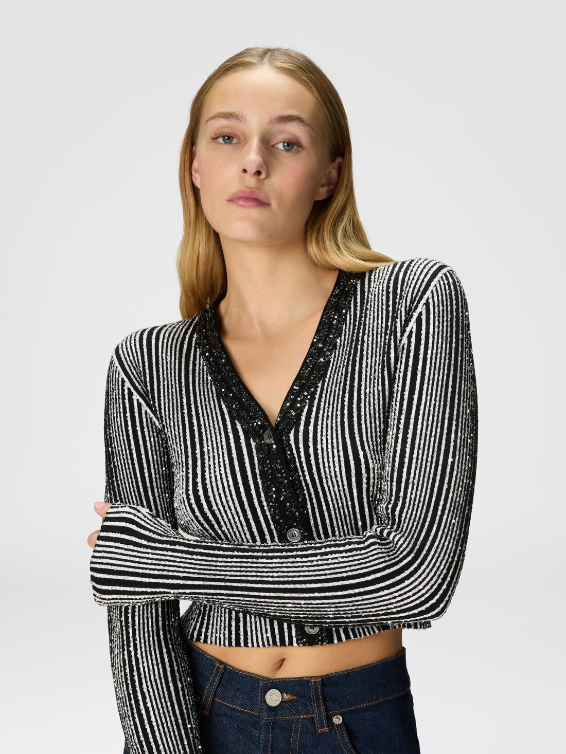 Ribbed knitting, vertical stripes and sequin appliqués: this is how the micro-cardigan, with buttons and V-neckline, conquers a place as the absolute protagonist of the evening look.