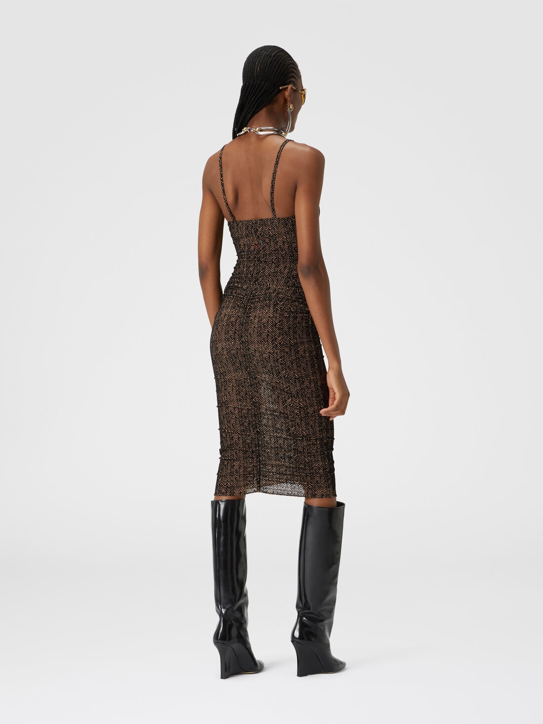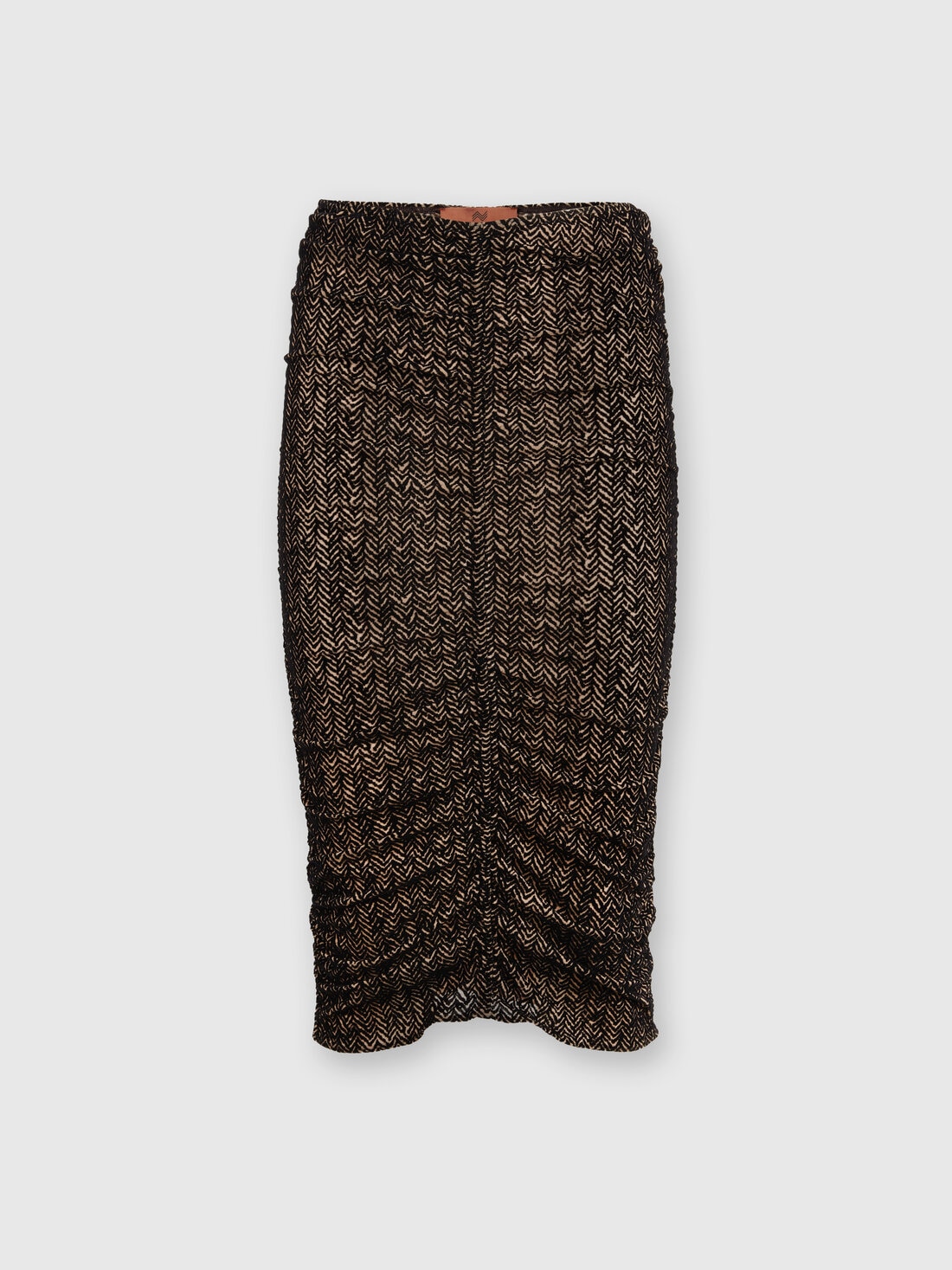 The front gathering and tube cut characterize the tulle lunguette skirt with zigzag flocked print. Made of stretch fabric, the garment emphasizes the silhouette with a new interpretation of chevron.