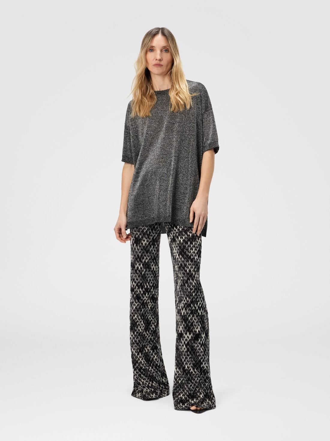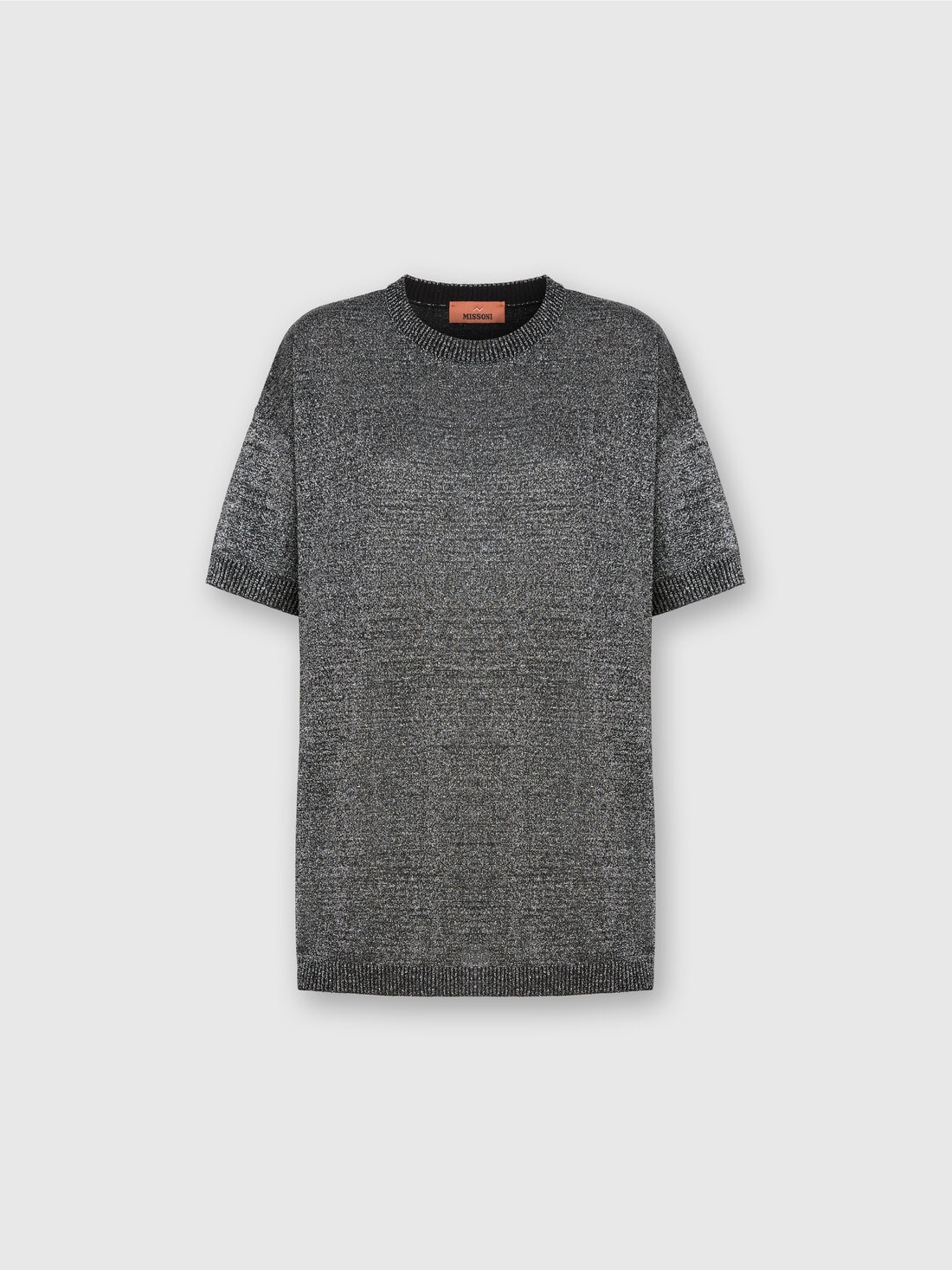 Boxy short-sleeve crew-neck women’s sweater, characterized by refined vanisé workmanship that enriches the garment with an elegant texture. Lamé threads sprinkle the surface, adding shine and a touch of brilliance, for a sophisticated and modern look that expresses all of Missoni’s mastery in the details.