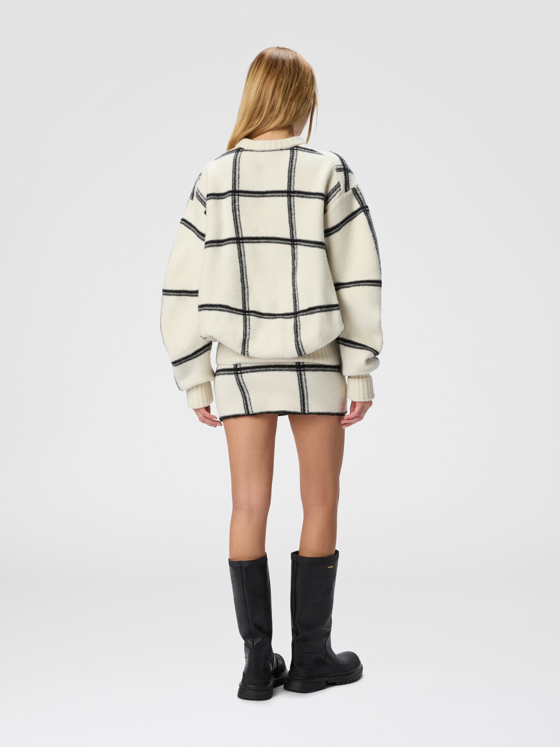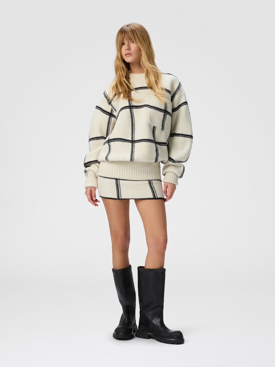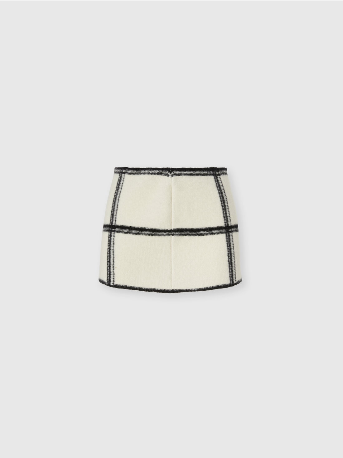 This women’s mini skirt in check jacquard knit, made of 100% wool, features a graphic and modern design. The check motif adds a distinctive touch, while the wool’s softness ensures comfort and warmth. Its compact structure and slim silhouette make it perfect for an elegant, contemporary look—ideal for impactful styling.