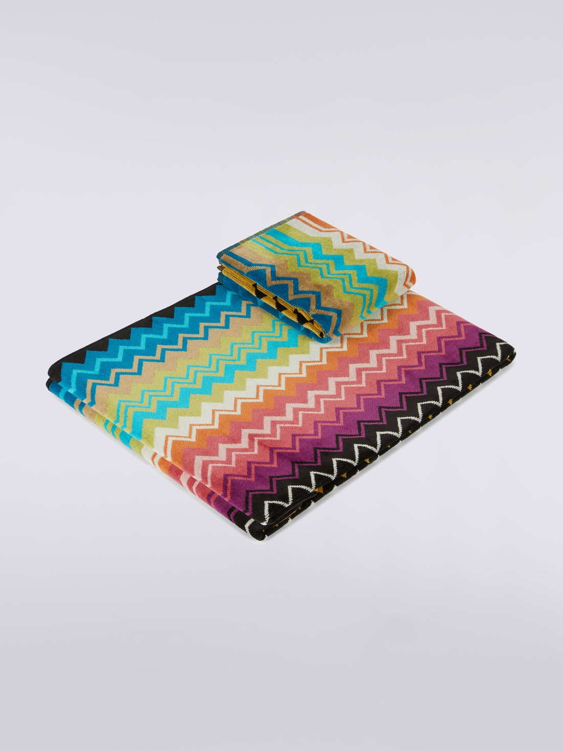 The Giacomo two-piece towel set is the quintessence of Missoni style: here, the quality of the velour cotton terry meets the definition of the chevron print, which dips into the striped edges to enliven this beautiful and timeless pair of face and guest towels.