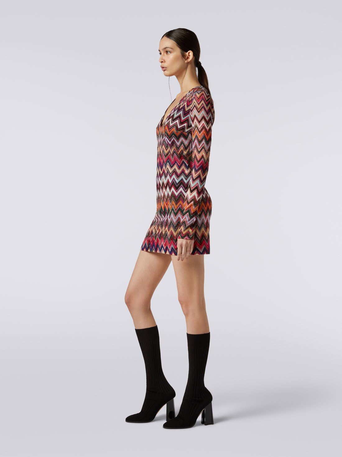 A women’s dress that celebrates fashion in all its splendour, the long-sleeved viscose knit dress by Missoni. Featuring the classic all-over chevron motif, it sports the addition of bright lurex threads and an elegant V neckline.