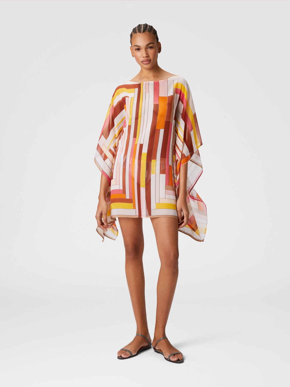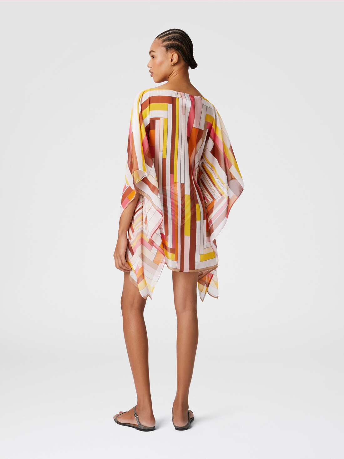 This short caftan, made of precious printed silk, stands out for its zigzag pattern, an unmistakable signature of Missoni. The wide sleeves and V-neck add a sense of lightness and sophistication, making it perfect for a chic summer look. The lightweight fabric and vibrant print make it a versatile garment, ideal for both the beach and for a refined summer look.