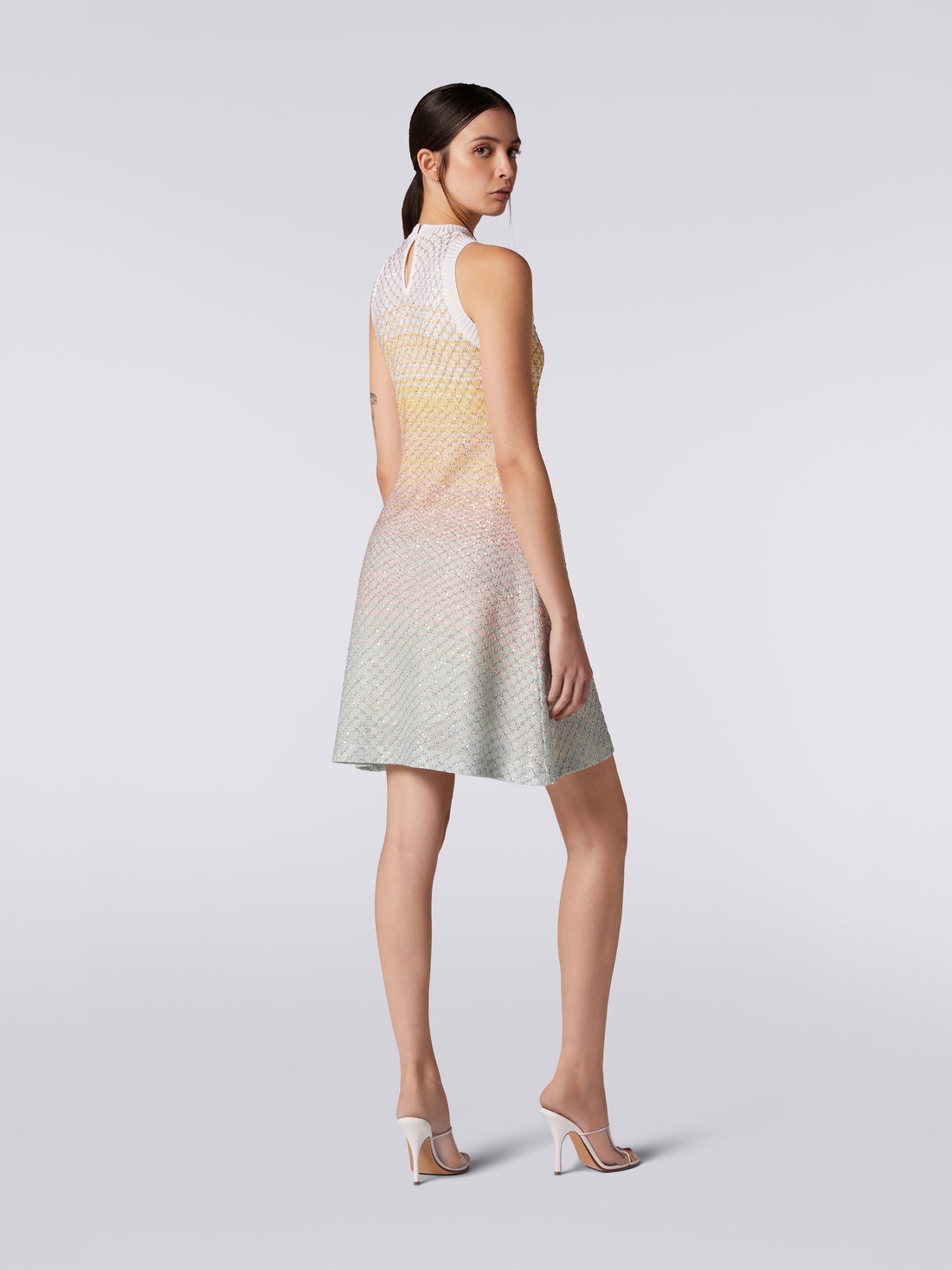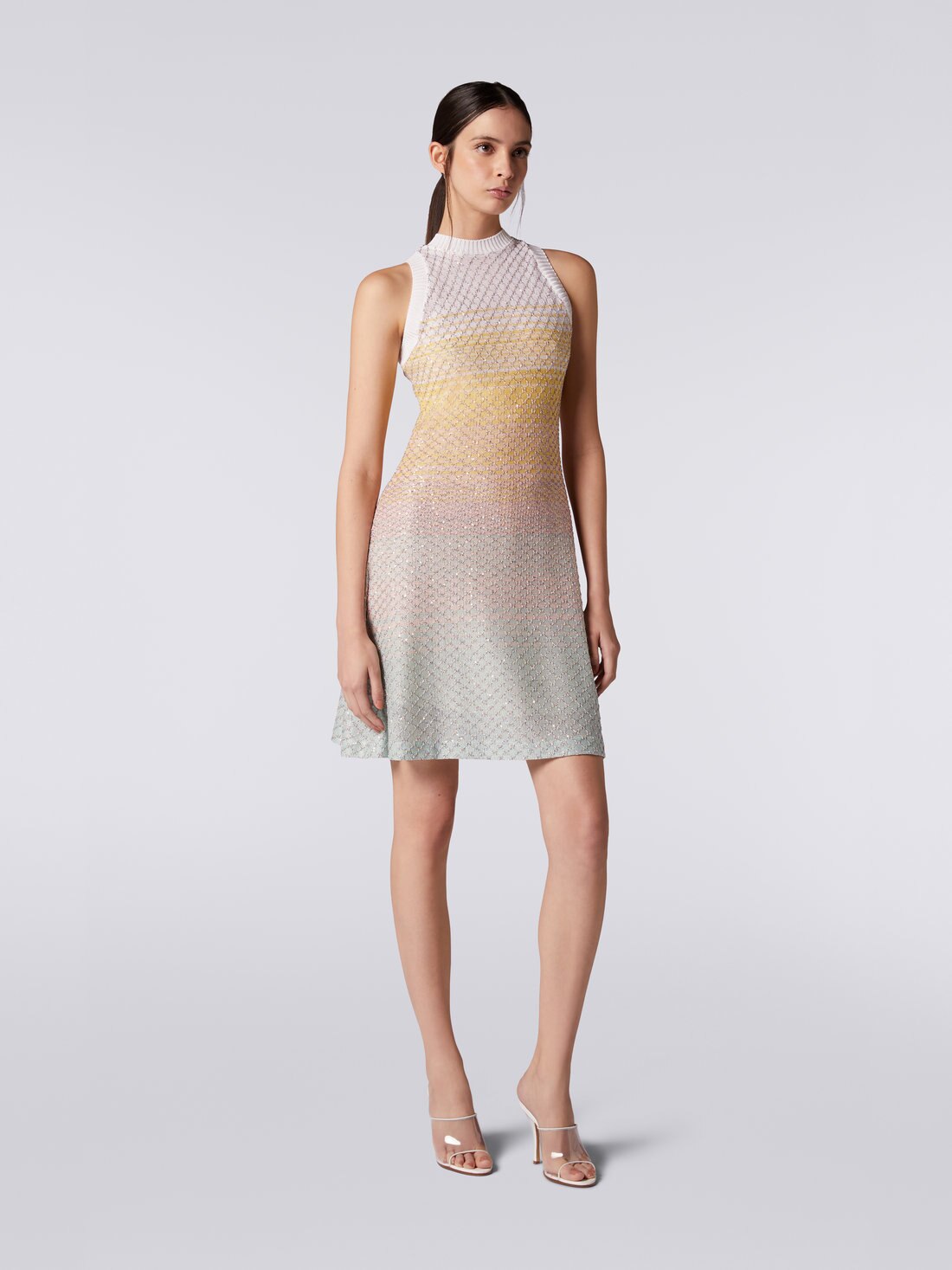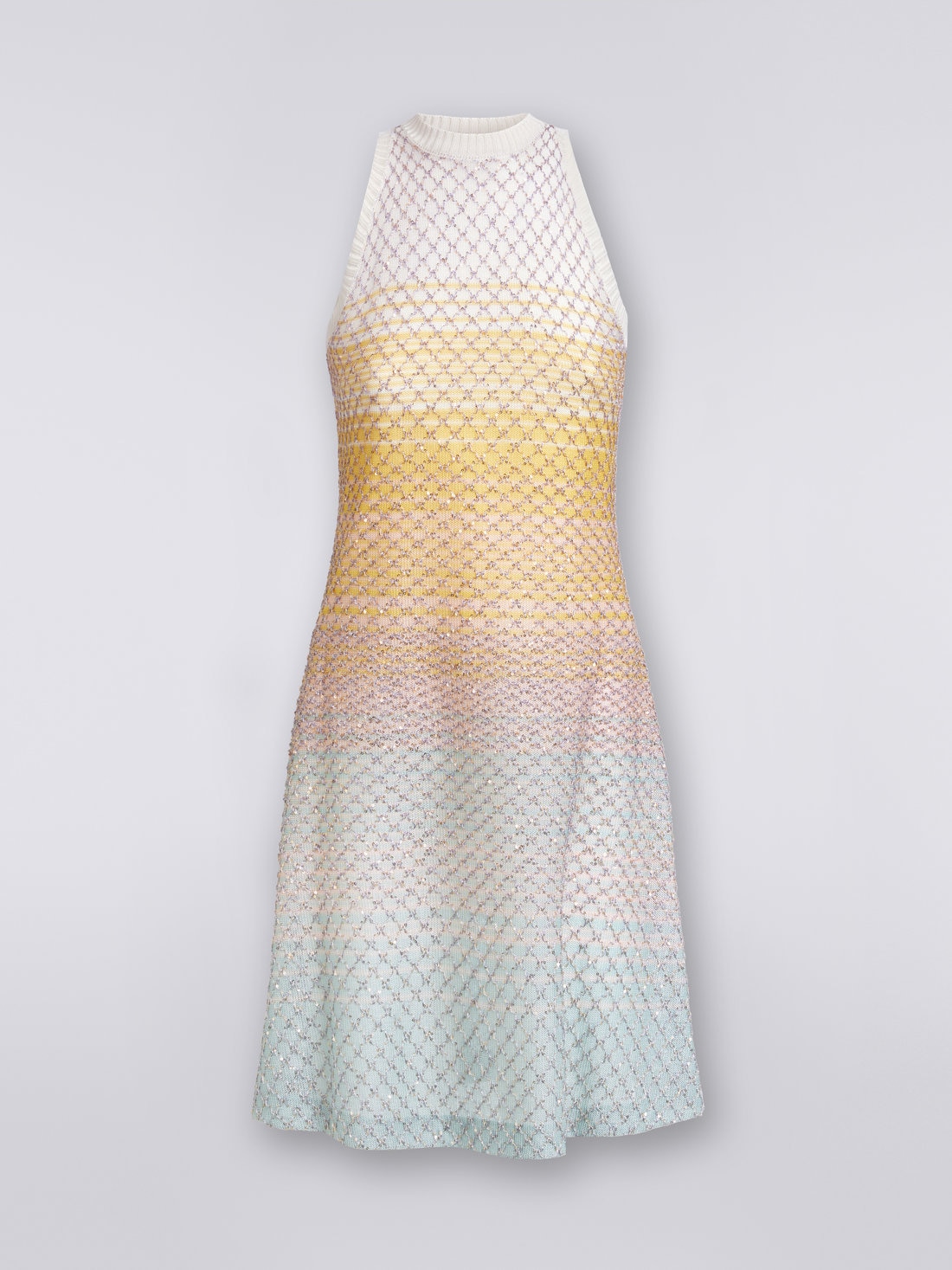 The colour that gradually becomes brighter, the sequins embellishing the mesh, the flared bottom and the sports-inspired neckline: these are the features that make the women’s sleeveless dress a must-have for the summer.