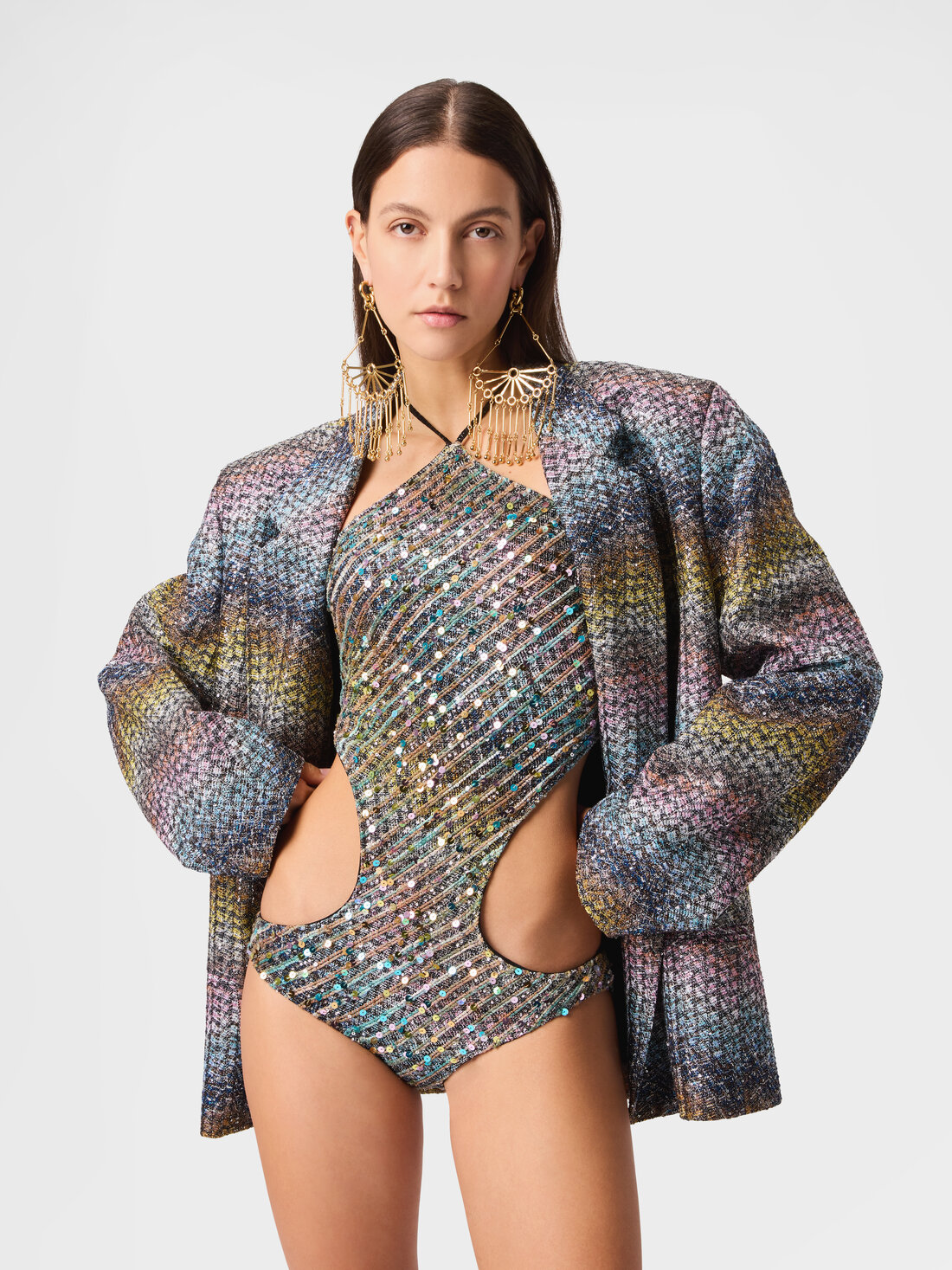 This women’s trikini with halterneck neckline expresses a bold and luminous design, crafted on the Caperdoni loom in a viscose blend with zig zag motif. The application of large sequins enhances the graphic texture, giving the piece a strong visual impact and decisive elegance.