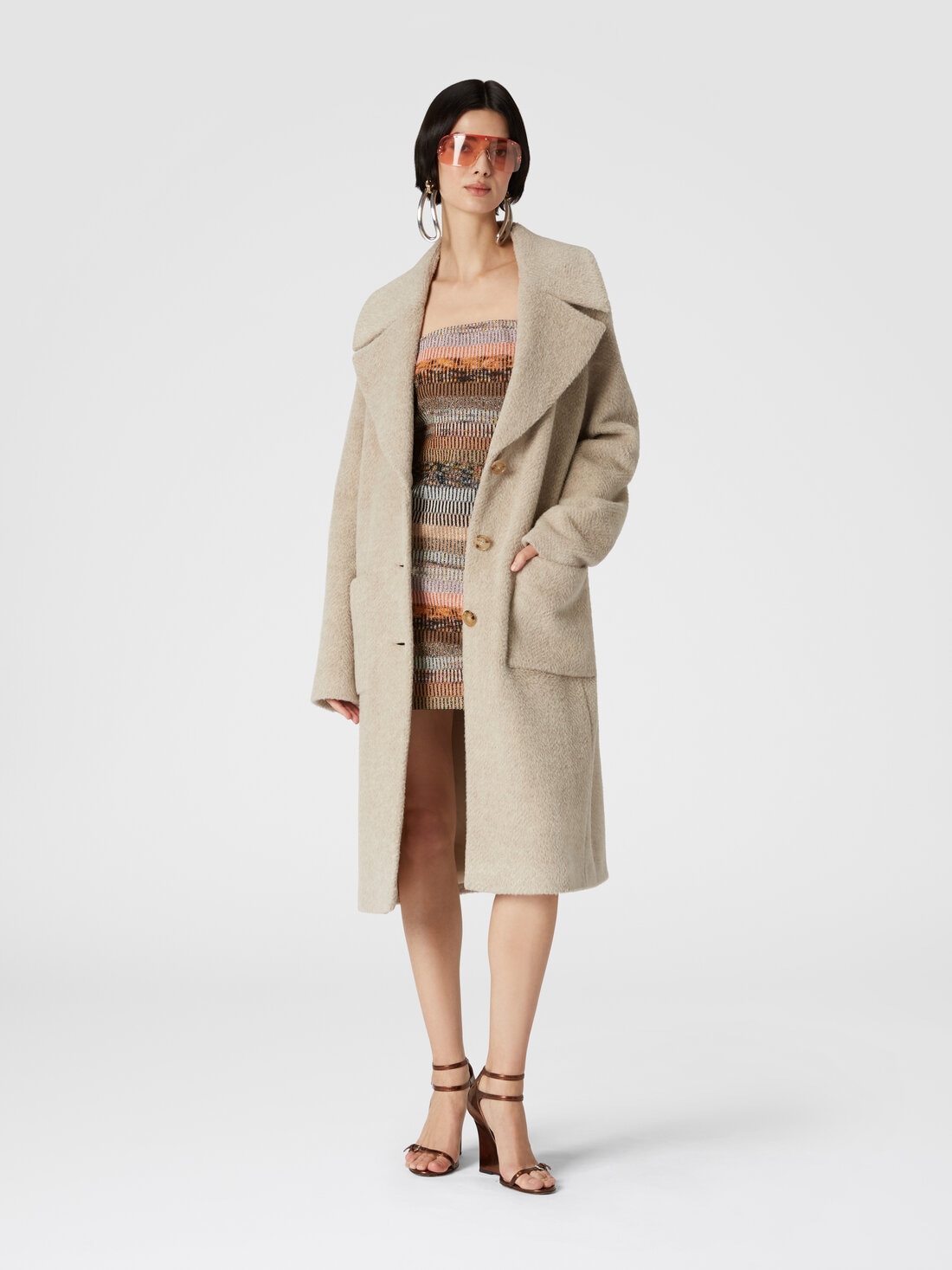 A sumptuous, very warm and soft blend of alpaca and wool for the long coat with wide lapels. The outerwear, enlivened by the tone-on-tone zigzag pattern, features horn buttons and patch pockets.