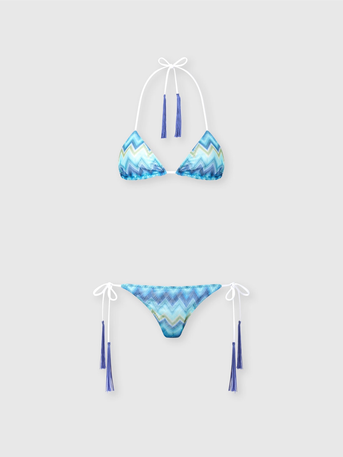 With a graphic and bold design, this triangle bikini with tassels for women is made with raschel workmanship and features a print of shaded micro and macro stripes on a zigzag background, an iconic style code of Missoni. A garment full of personality, designed for those who want a distinctive and vibrant look.