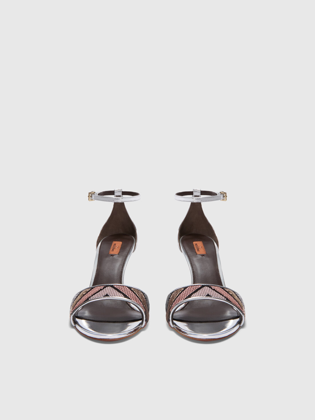 Elegance and distinctive style come together in these Missoni heeled sandals with ankle straps. The sequined band is enhanced by the brand's signature zigzag pattern, catching the light with every step. The adjustable ankle strap ensures a comfortable and secure fit, while the solid-color heel completes the design with a touch of class. A sophisticated sandal, perfect for adding sparkle and character to elegant and contemporary looks.