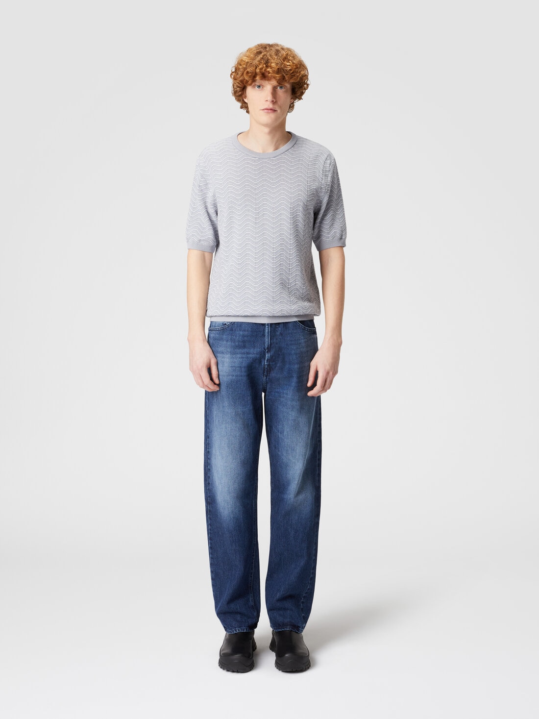 A new pattern of the season, the jacquard Venezia motif animates the knitted inserts of the five-pocket denim. A postcard garment that pays homage to one of the most iconic cities in Italy.