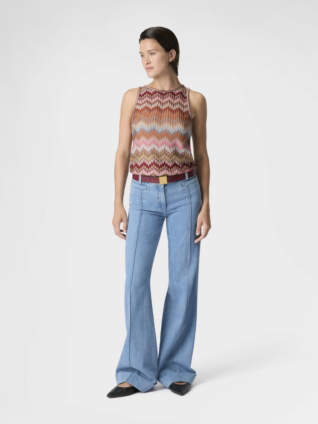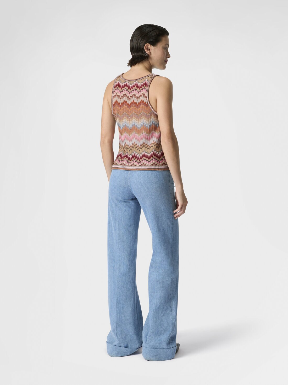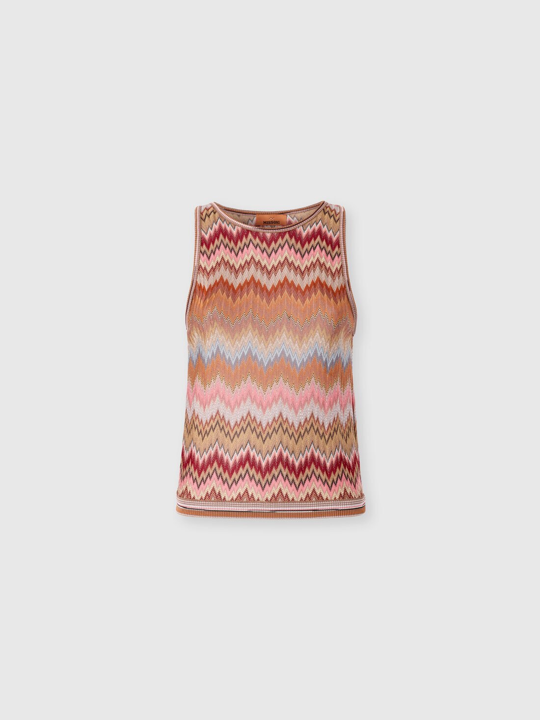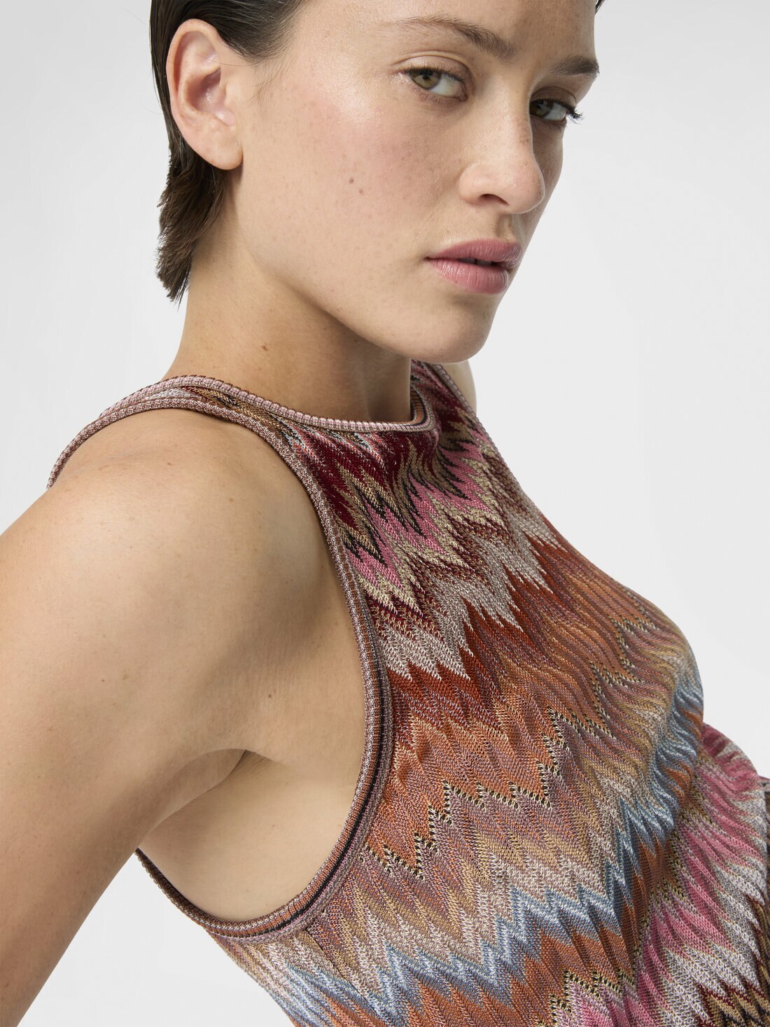 The snake motif intertwines with Missoni’s classic chevron in this sleeveless women’s top in viscose, enhanced by raschel workmanship that accentuates its structure and lightness. A perfect balance between graphic artistry and craftsmanship.