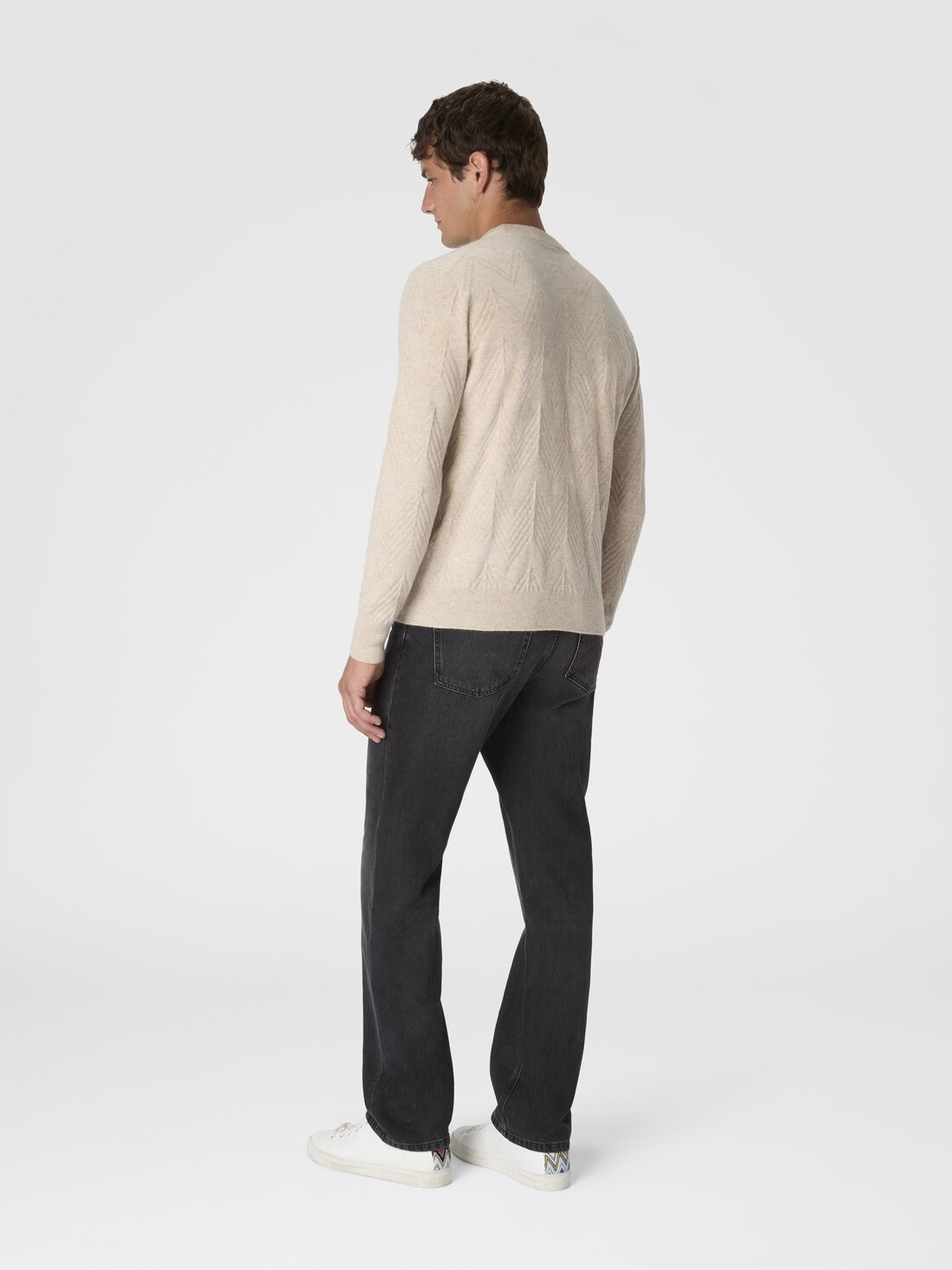 Missoni’s signature motif brings this men’s crew-neck sweater in 100% cashmere to life with its tone-on-tone zigzag, giving the piece subtle elegance. The delicate weave, crafted with mastery, creates a unique visual effect, while the softness of cashmere wraps the body in unmatched comfort.