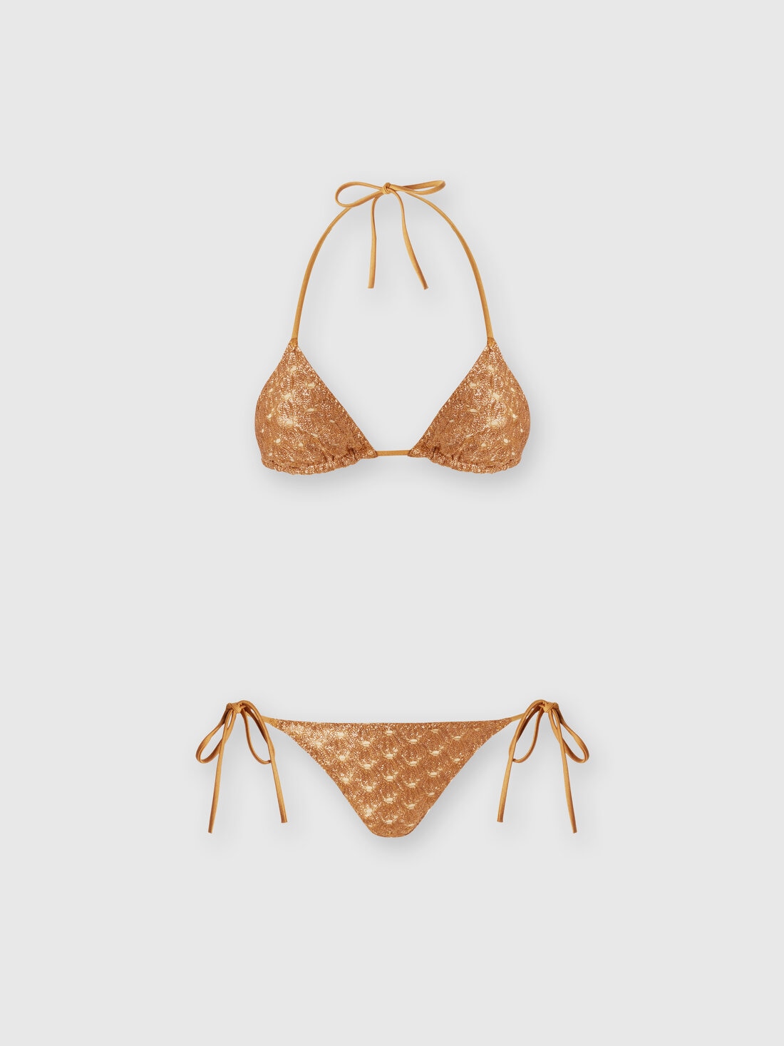 Bikini-format sophistication for the piece in pure viscose lace effect with a glossy finish and neutral-coloured lining. Comprising a triangle top and side-tie briefs, this women’s two-piece embodies the more luxurious spirit of beachwear according to Missoni.