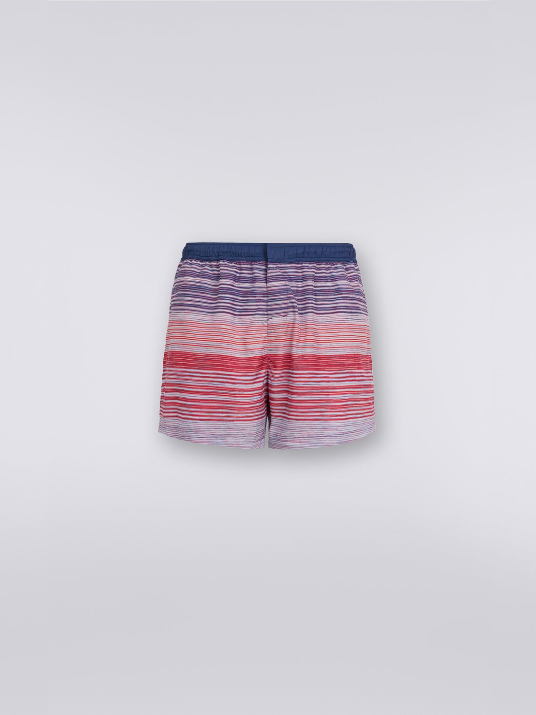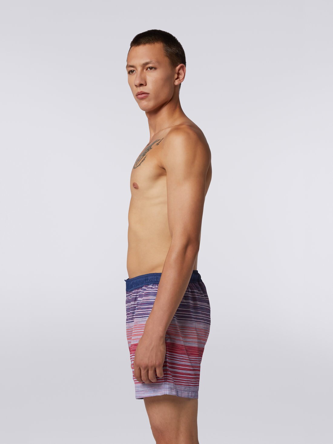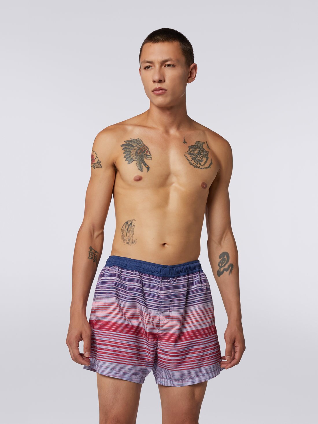 The multicoloured flamboyant print characterises the nylon blend men’s swimming trunks. The mid-length piece is enriched with an elasticated waistband in a plain colour, and features a Velcro fastening, a back pocket with flap and logo label, and side welt pockets.