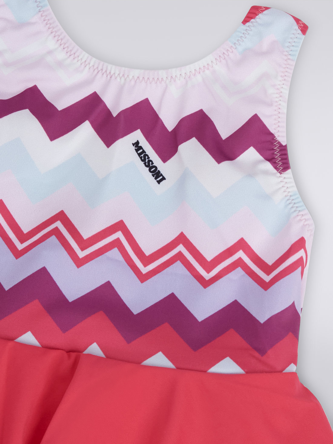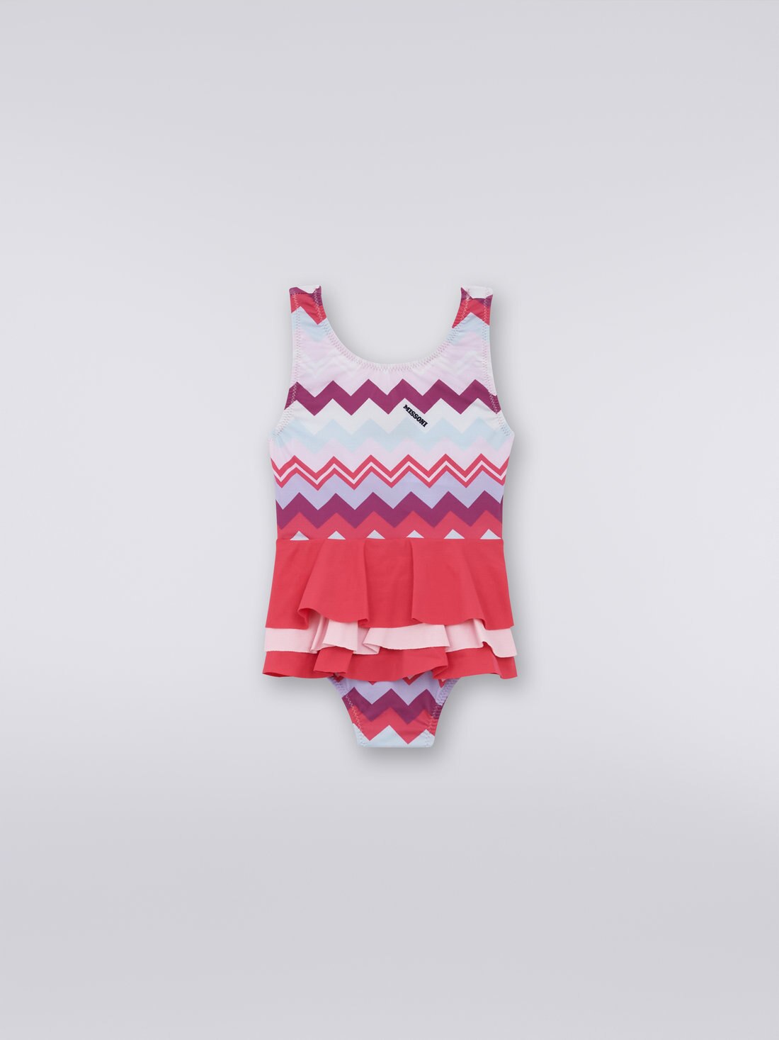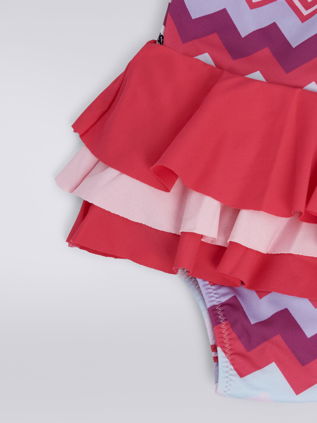 A cute ruffle design characterises the girls’ one-piece swimming costume with a round neckline and comfortable wide straps. The fully lined piece is embellished with a zigzag print with logo.